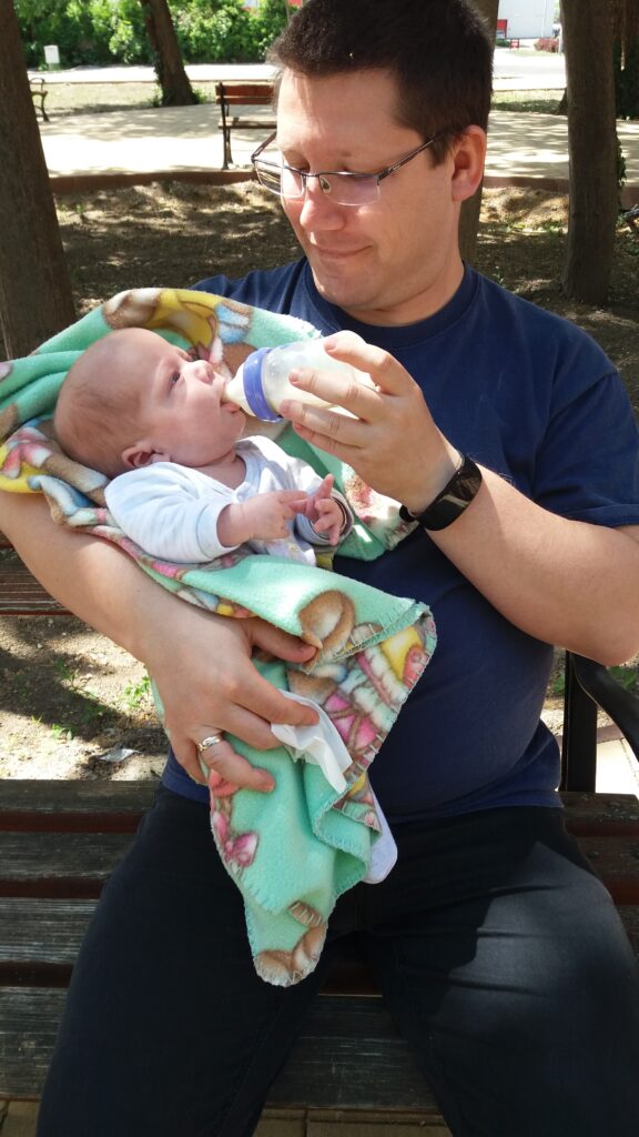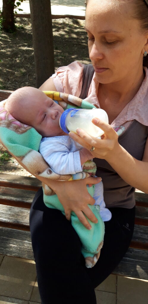 Apával kettesbe maradtam míg Anya a beszerzést intézte el. Állítólga kapok új cumit amivel könnyebben tudok nagy mennyiséget lehürpinteni. Valamire készülnek. Hoztak másik tápszert is azzal a mondattal, hogy kipróbáljuk. Na majd meglátjuk.