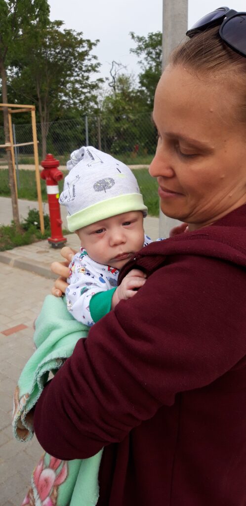 Délután kimentünk sétálni. Na tudtam én, erre tartalékoltam az erőmet. Amint már nem láttam a házunkat, akkor jeleztem hogy éhes vagyok. A szülők mosolyogtak, hogy őké erre számítottak. Adtak enni. Viszont arra nem számítottak, hogy egy hörpintésre bezúzom az adagot. Így kicsi tanakodás után Anya hazament és hozott utánpótlást. Apával vártunk addig. Miután Anya visszajött a verdába nem akartam beszállni így kézbe vittek sétálni. Ekkor gondolhatták volna, hogy hozzák a kengurú erszényt mert én nem megyek vissza a verdába.