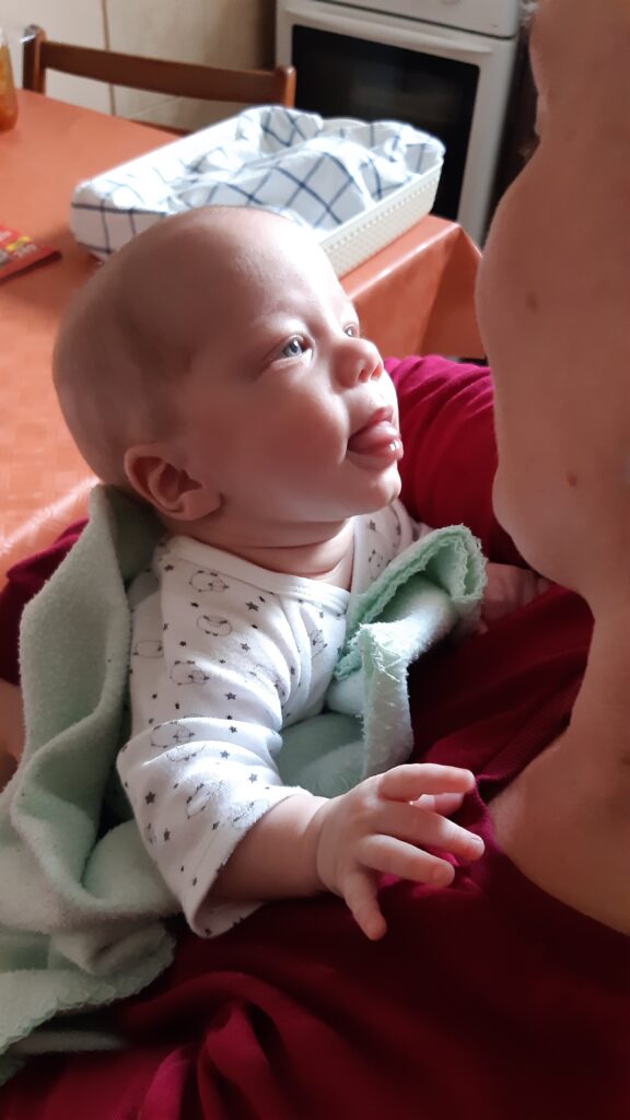 Kedden egész nap Zsuzsi és a Mami vigyázott Petire. Napközben volt sok pelus csere és mókázás. próbálgatták hogyan másolja le ha nyújtja valaki a nyelvét