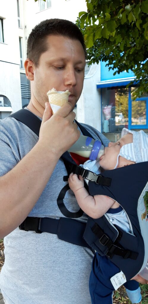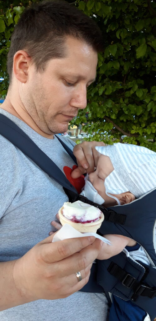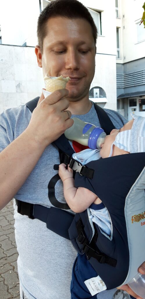 Már vártam mikor megyünk ki sétálni. Elindultunk a fagyizó irányába. egyre jobban érdekel mit esznek ezen a szülők. Így szigórúan csak a szám szélére kaptam egy kis adagot. Ez tetszett nekem nagyon. Hideg volt és jó íze. Ezen felbudulva szerettem volna többet, de nem adtak.