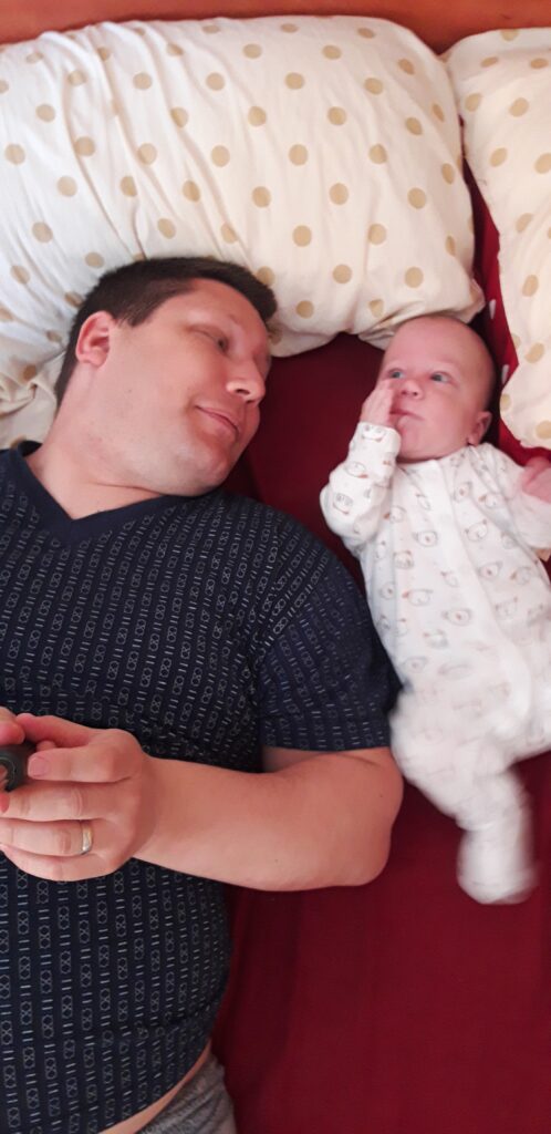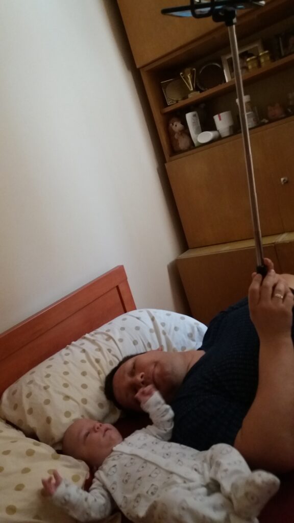 Apa nem nagyon bírt velem, de úgy döntött, közösen pihenjünk egy kicsit. Erre csak nem selfi-ket csinálnak róla. Semmi baj mert így együtt a család. A sok pózolásban kifáradtam így reggeliztem majd kifeküdtem aludni.