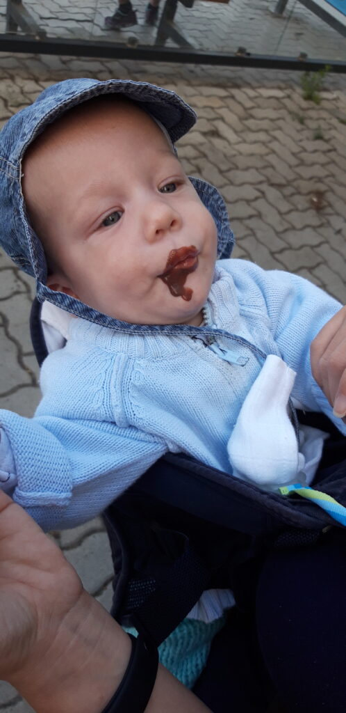 Az álkaja után, igazi játékot, majd igazi alvást produkáltam. Alvás után alig vártam, hogy mehessünk ki. Sétáltunk egy kicsit majd szembe találtkoztunk Apával. Kiegészült a család és elmentük a már megszokott helyre hideg édességet nyalni egy kicsit. Én addig erősködtem míg ki nem kenték a számat. Mit ne mondjak most már értem miért szeretik ezt a cuccot.