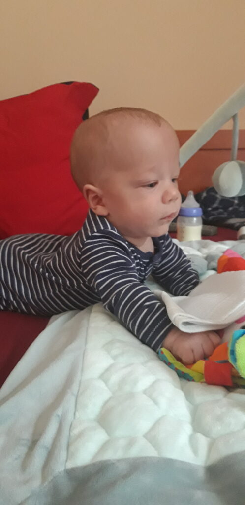 Délután már tovább fenn voltam, de nem tudtam kivárni míg Apa megérkezik, így rápihentem a délutánra. Miután megérkezett játszottunk egy kicsit a szőnyegen.