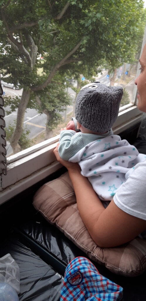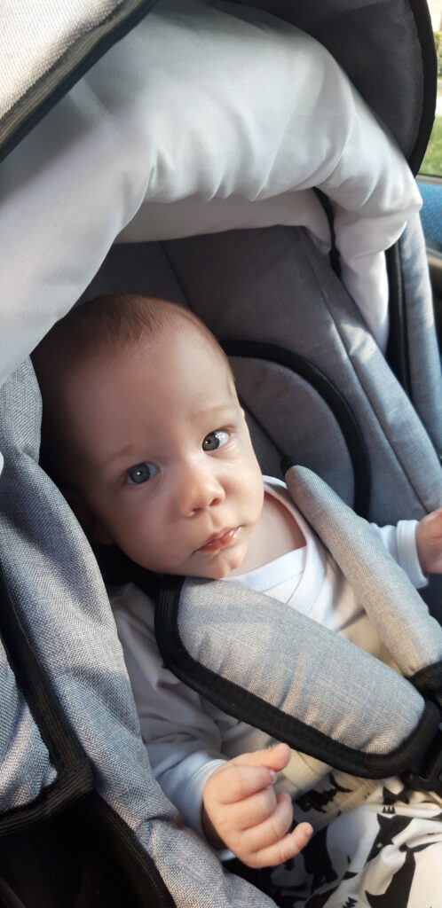 Hétfőn a nagy séta során kipróbáltunk új dolgokat. Valami furcsa cucc volt. Apa is és Anya is velem beleült és oda-vissza mozogtunk.