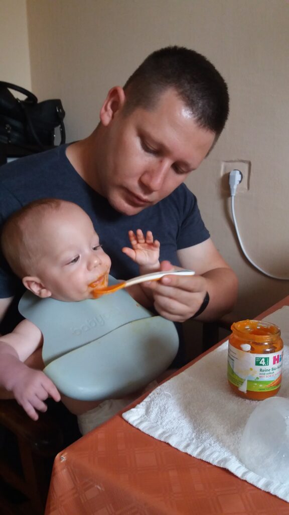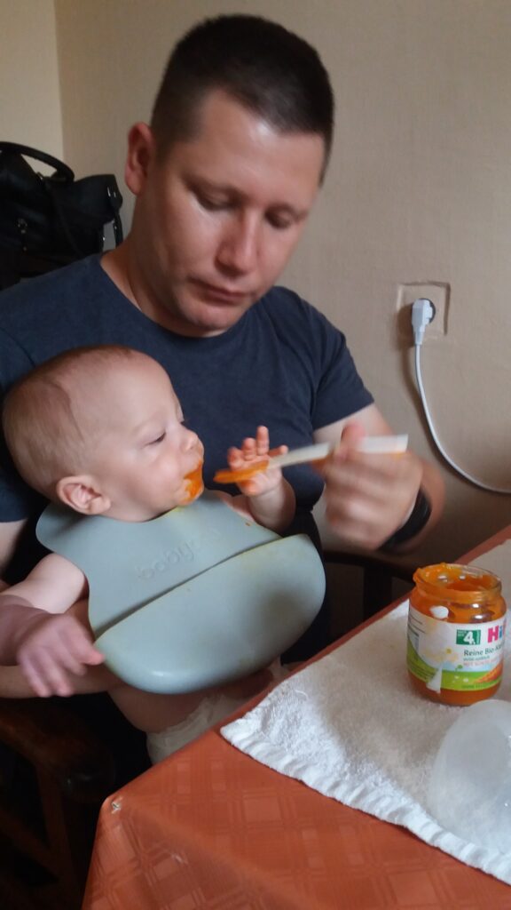 A nagy melegre való tekintettel hazajöttünk. Itthon némi boxutca kiállás után Apával püré bulit rendeztünk, amibe bekapcsolódott Anya is. Mondhatni most jől csúszott a piros püré szinte az üveg felét meg is ettem. Mellékesem megjegyzem elhasználotunk ipari mennyiségű törlőkendőt, a tiszta képekért.