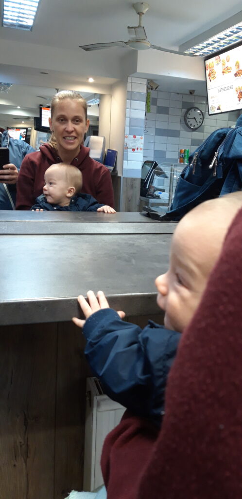 Nekem már sok volt a mai napra a kocsiba vagy a ferdában való félig ülés, szóval szóvá is tettem, és kikéretszkedtem. Így sétáltunk. Nem tudom hol voltunk, de a pultosok már majdnem összepisilték magukat tőlem. Persze kedvezményt csak nem adtak. Amíg vártunk a sorunkra mókáztunk egyet.