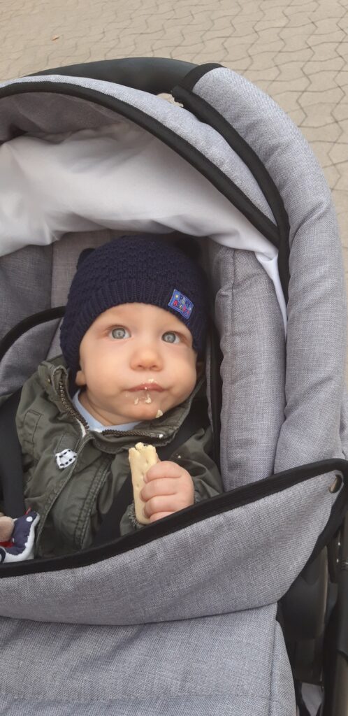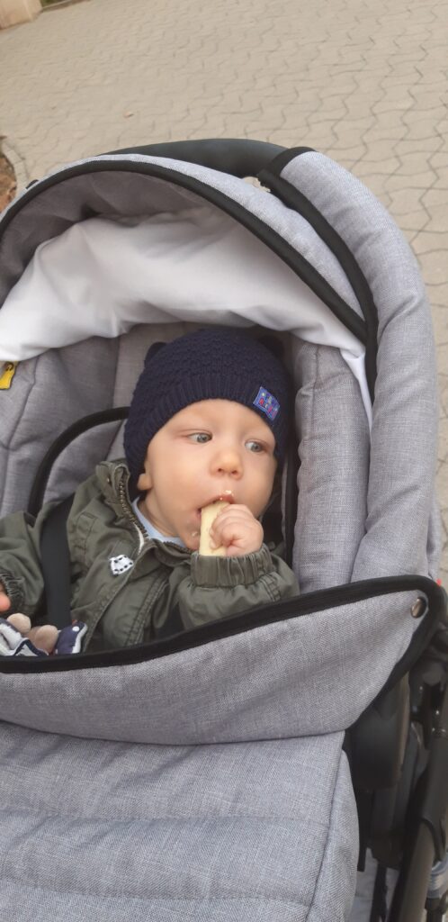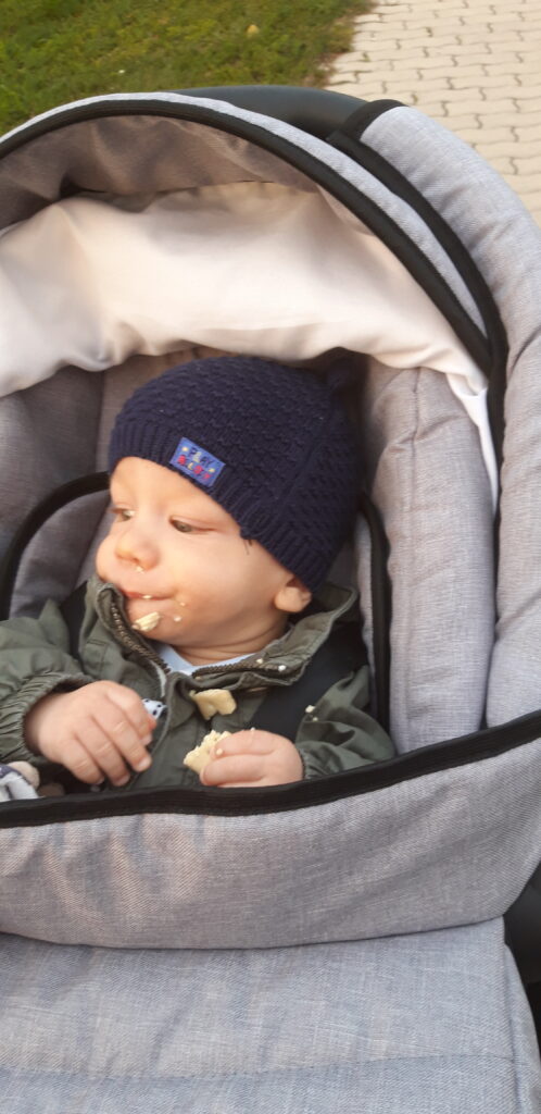 Délután megint a séte elött teljes menetfelszerelésben lettem rettentően éhes. A végét nem is tudom csak arra ébredtem fel, hogy kinn vagyunk a szabadba és a szülők mosolyognak rám.
