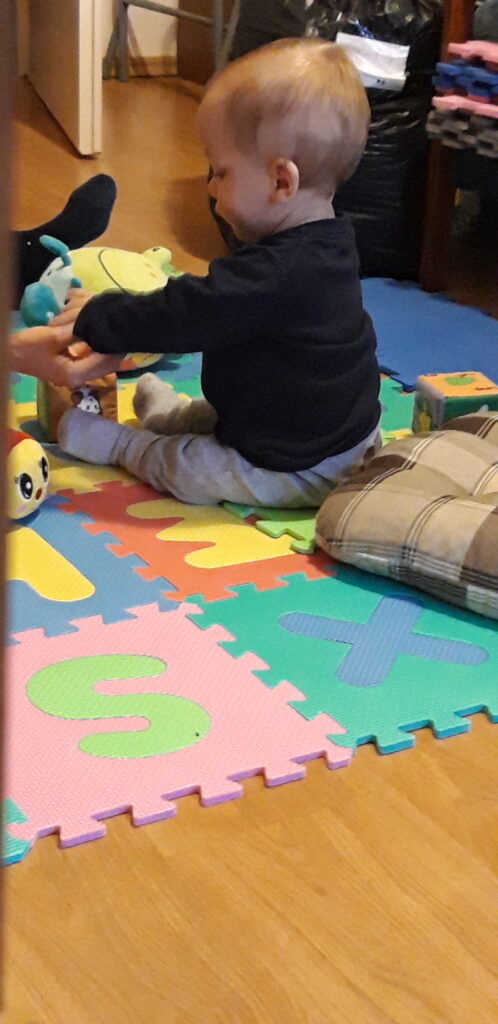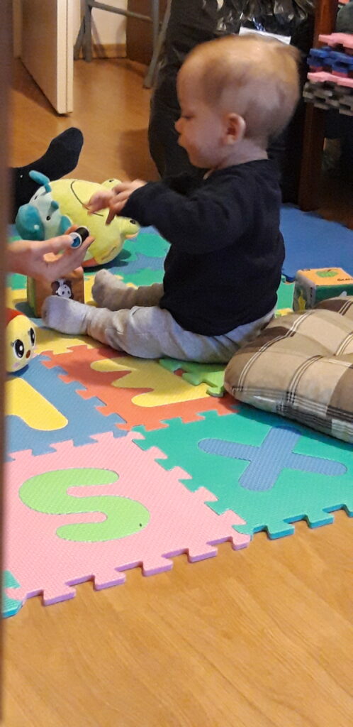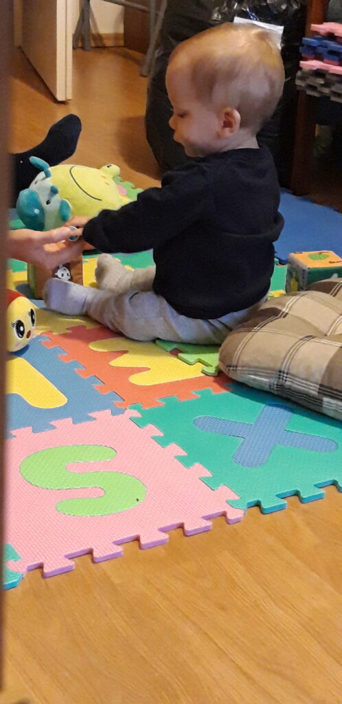 Ebéd után kell egy kis testmozgás így megint a játszó szőnyegen voltam. Amíg Anya megvarta a ruhákat addig én lebontottam a fél szivacs halmot. Sőt érdekelt az is mivel dolgozik Anya.