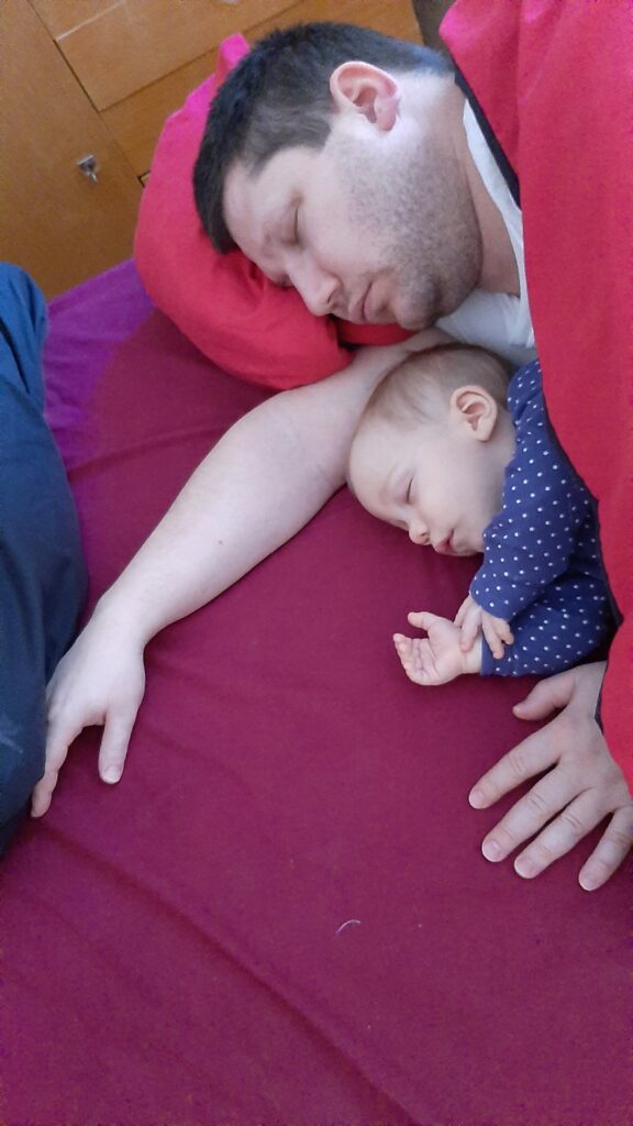 Délelött tornáztunk, majd a tízórait kanállal ettük meg Apával és vele sziesztáztam. Kicsit elalaludt én meg vigyáztam az álmát, annyira, hogy én is aludtam vele.