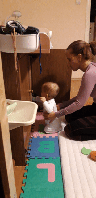 Egy jó kis séta után hazajöttünk felmelegedni. Itthon újabb mókás dolgot találtam ki, igyekszek elérni a szekrény gomját és megnézni a mögötte lévőő világot. Persze csak felügyelettel pakolok még ki.