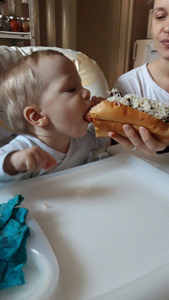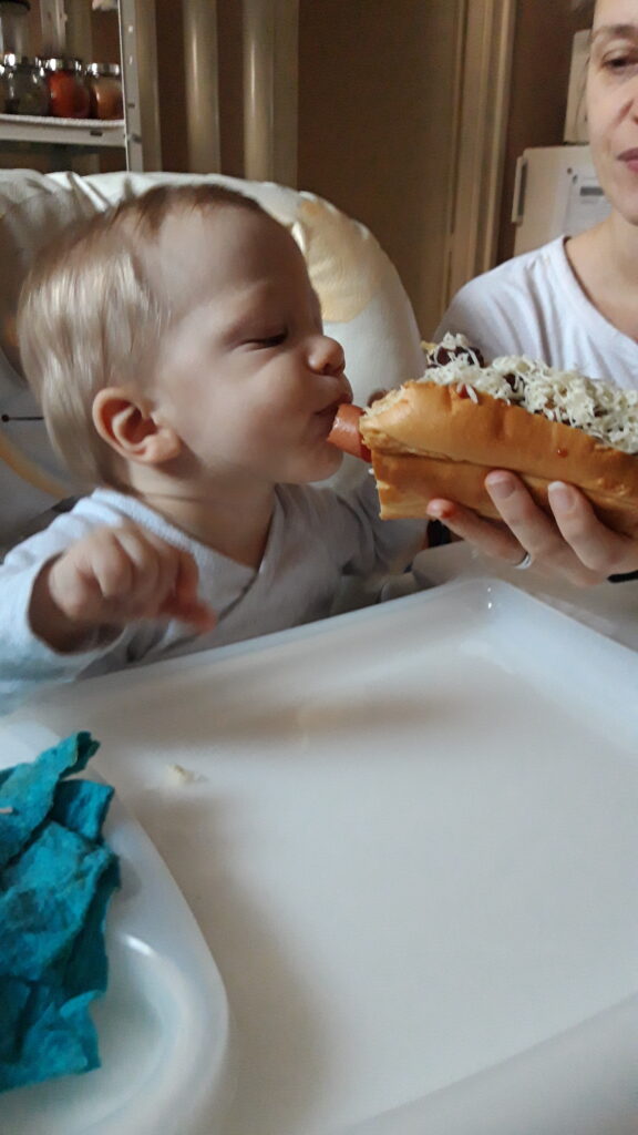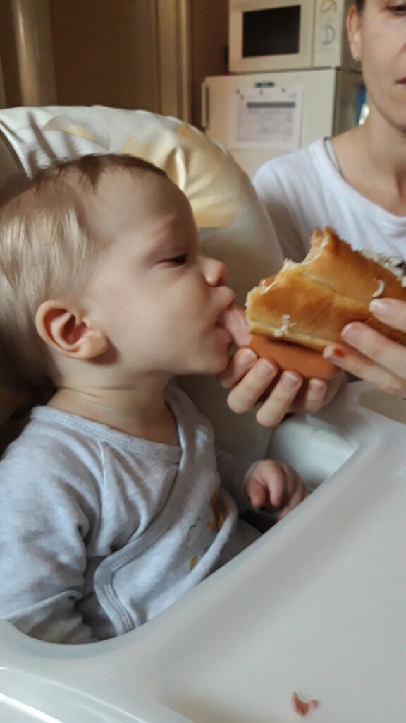 Végre a szülők is reggeliztek így én is velük bandáztam. Természetesen meg kell kostolni mit esznek. Aham azt hiszik nem veszem észre, hogy nem z Ő kajájukat adják oda hanem egy előre elkészített virslit. Na várjatok csak ha nagy leszek vissza kapjátok.