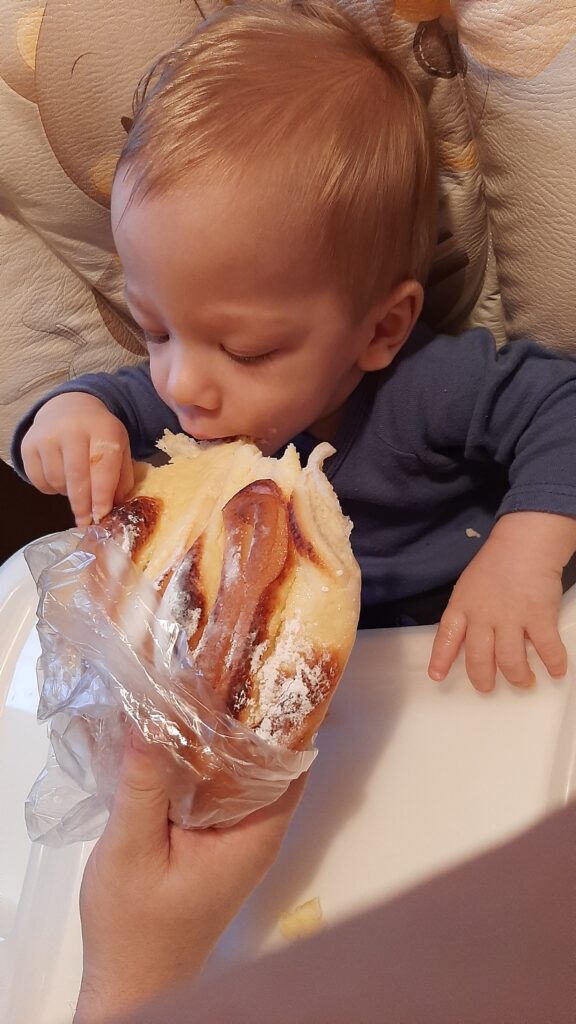 éjszaka jót aludtam, reggel mire felébredtem Apa eltűnt de nemsokára megjelent hadizsákmányokkal. Le is stoppoltam tőle a túrós kaját. Fater ezt majd én betolom. Jah nem az egészet de jól bele marcangoltam.