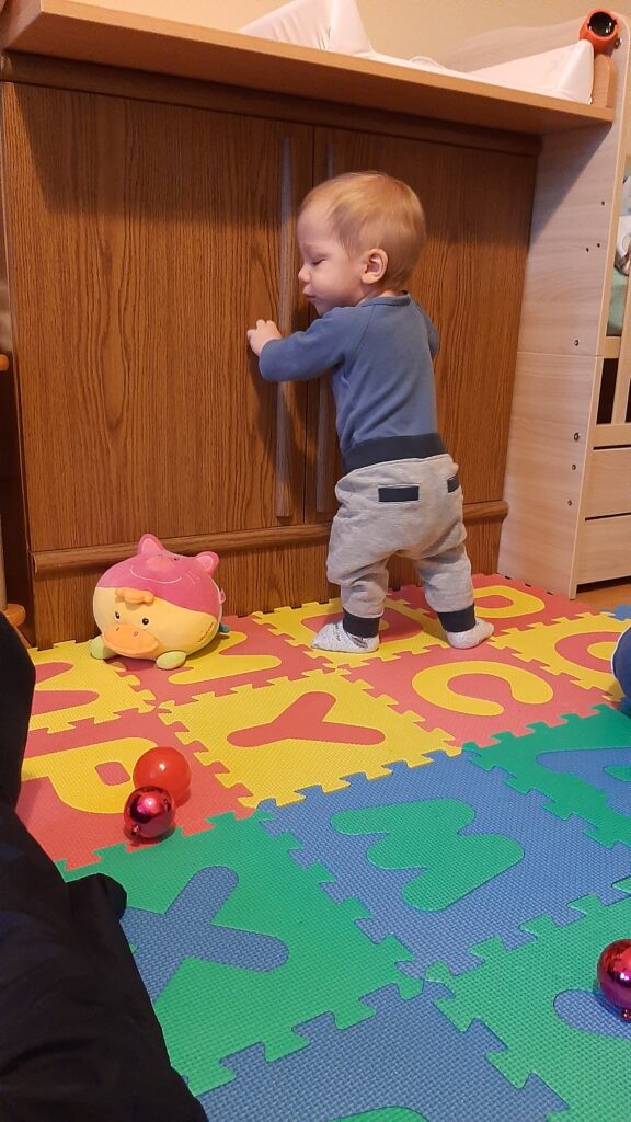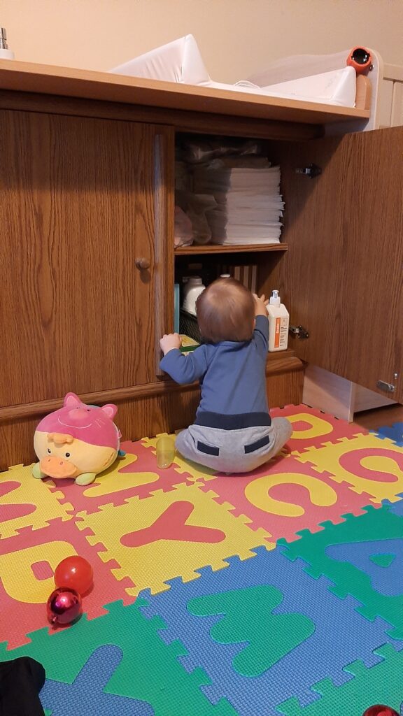 Reggeli után megjött az erőm és áttörést értem el, eddig csak dörömböltem az ajtón most már ki is nyitottam. Ohh milyen csoda dolgokat találtam a pelenkázó alatt. Alig lehetett engem elcsábítani onnan.