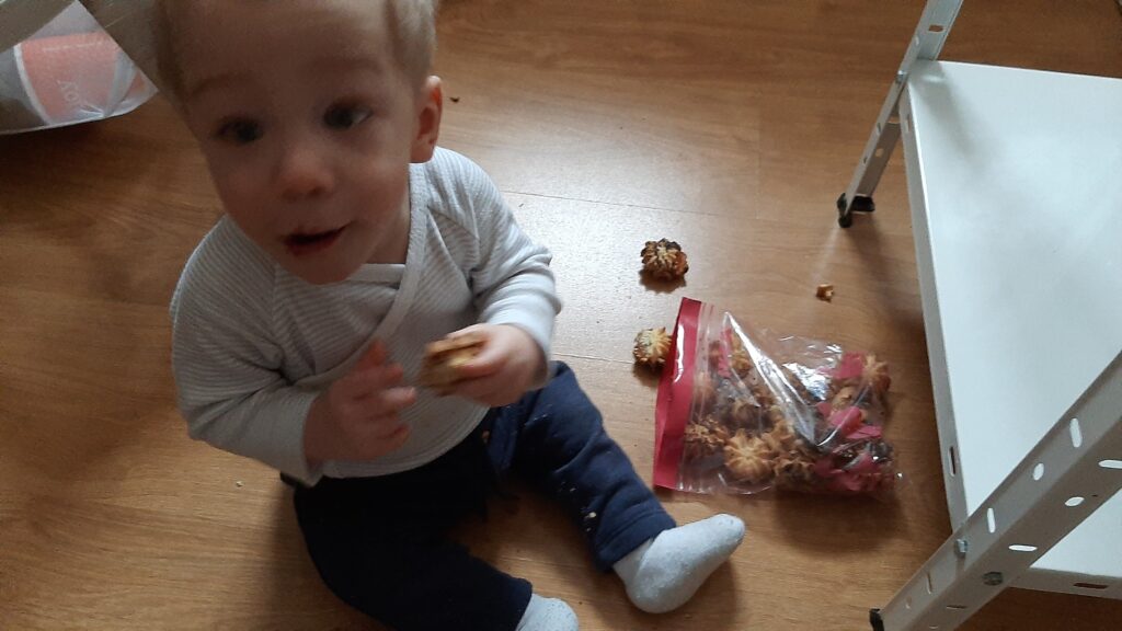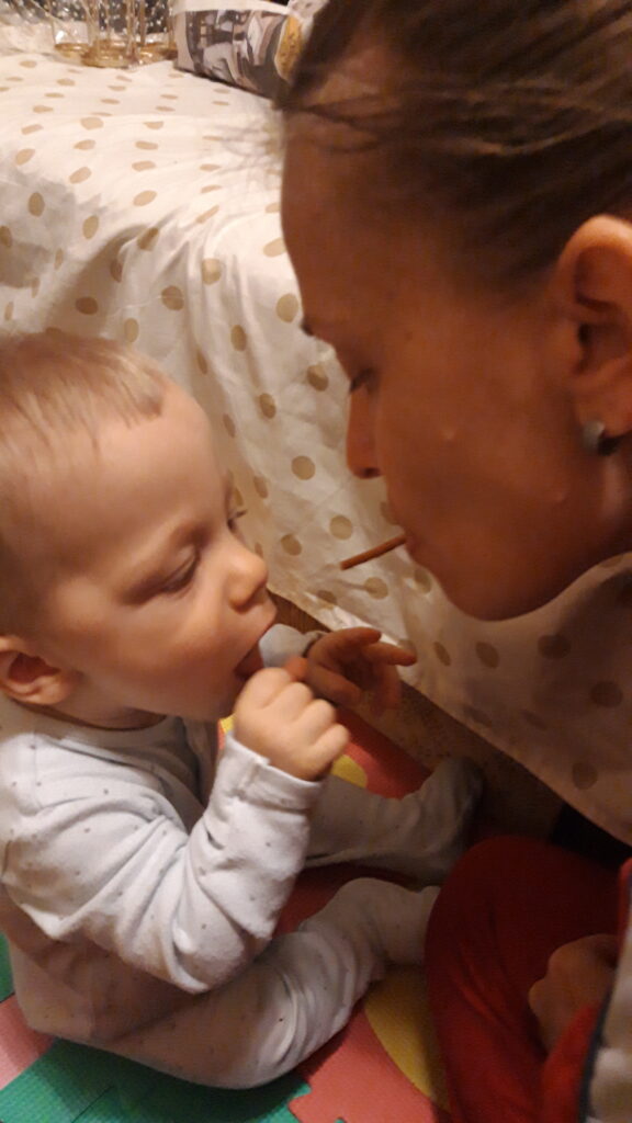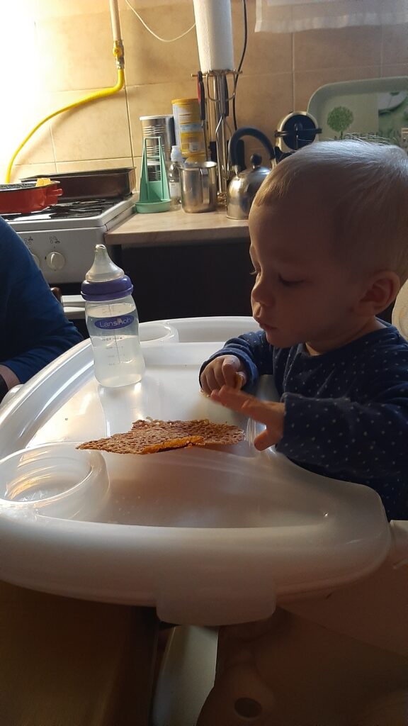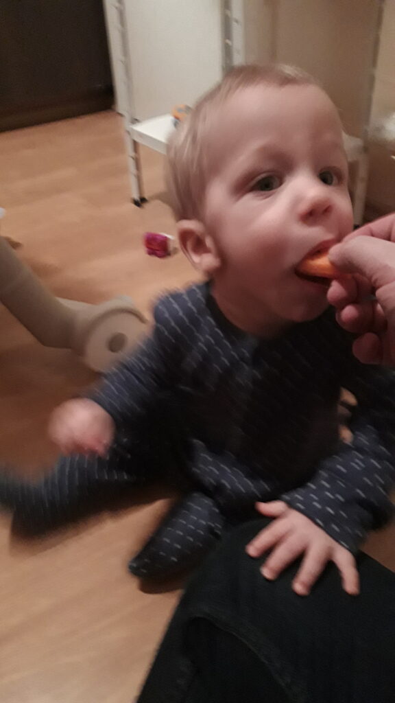 Vasárnapra virradó este többször is kértem ellátás. Végül már alig bírtam, így reggel egy húzóra lenyomtam az elkészített 180 ml-s tápszeremet. Majd a szülőkkel reggeliztem egy jót. A bundás kenyérből is csúszott rendesen. Délelött jókat mókáztunk, meg elmentünk bevásásrolni. Hazafele már nagyon lemerült az elemem, így behúztam egy cuminyi teát és be is aludtam. Jó nagyot aludtam először Apán majd Apával. Szerencsére mire felébredtünk már készen is volt az ebéd. A vasárnapi húslevesnél nincsen jobb egy korgó gyomronak .Főleg úgy hogy a tízórai kimaradt. Szóval jó nagy adag húsleves sok hússal, répával, krumplival ez nagyon bejön. Leves után kis tészta és husi. Ez nem csúszott annyira, de a desszert… Ohh az a diós alma, nagyon jó volt. A délután további részében, segítettem teregetni, ki és bepakolni, igazán házias munkákat csináltam. Sőt a nagypapi mikulás csomagjából a sós pálcikába is bele kóstoltam.