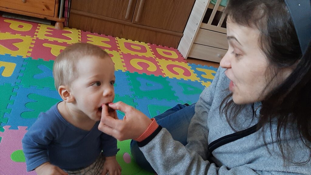 Pénteken hajnalban megint nyűgös voltam, szerencsére már tudtam a megoldást, Anya és Apa között jól esik elaludni. Reggelig jót is aludtam. Majd Anyáva jól elbandáztunk, megreggeliztünk és elindítottuk a napunkat mire a nagynéni is felébredt és csatlakozott hozzánk. Ha már reggeli büszkén jelenthetem be, most volt az első olyan alkalom amikor 1 doboz joghurt nem volt elég. meg se álltam a másodiknál a feléig. Innentől kezdve már jó voltam. Kibírtam a délelöttöt és beindult a móka gyár is. Jó sokat kokettáltam a nagynévivel meg kúsztam másztam így el is fáradtam és jó hosszút aludtam. Ébredéskor csak kuksoltam na ki van itt felvigyázó.