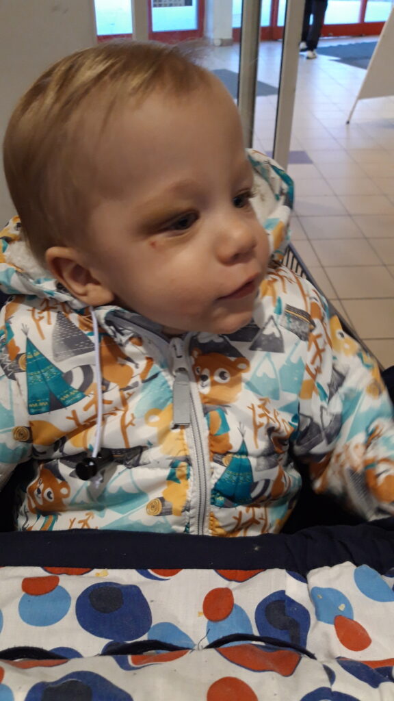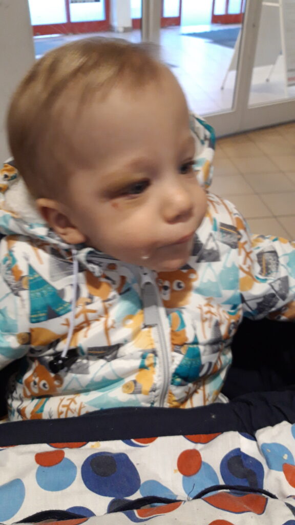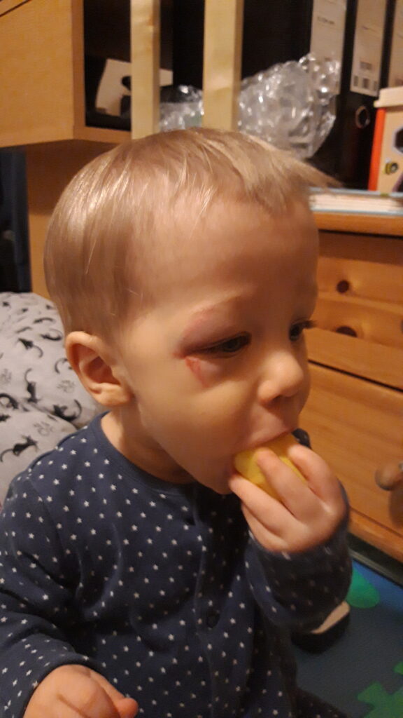 Csütörtökön aztán volt ám minden móka kacagás, sírás. Reggelre elfogyasztottam mindent mi ki volt készítve nekem. Apa éppen surrant volna ki mikor rákérdeztem hova hova. Így már nem is sietett annyira. Délelött elmentünk kicsit vásárolni. De jaja mi lett a vége. Hazaérve már kicsit szűk volt az ülés nekem így menetkülni akartam belőle a nagynéni segített. Ajaj Ő sem gondolta mi lett a vége. Kiszabadultam és a nagy verdában rosz helyre huppantam, szerencsére a szememnek nem lett baja, de az első nagyobb monoklimat begyűjtöttem kesereves sírás közepette. Mire haazértünk már látszódott a helye hol ütöttem be magamat.
