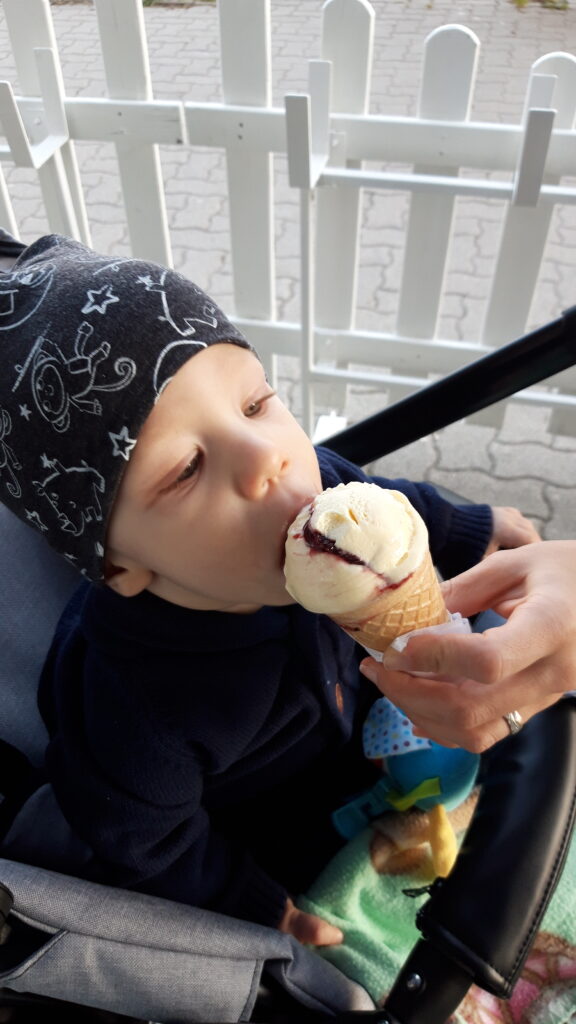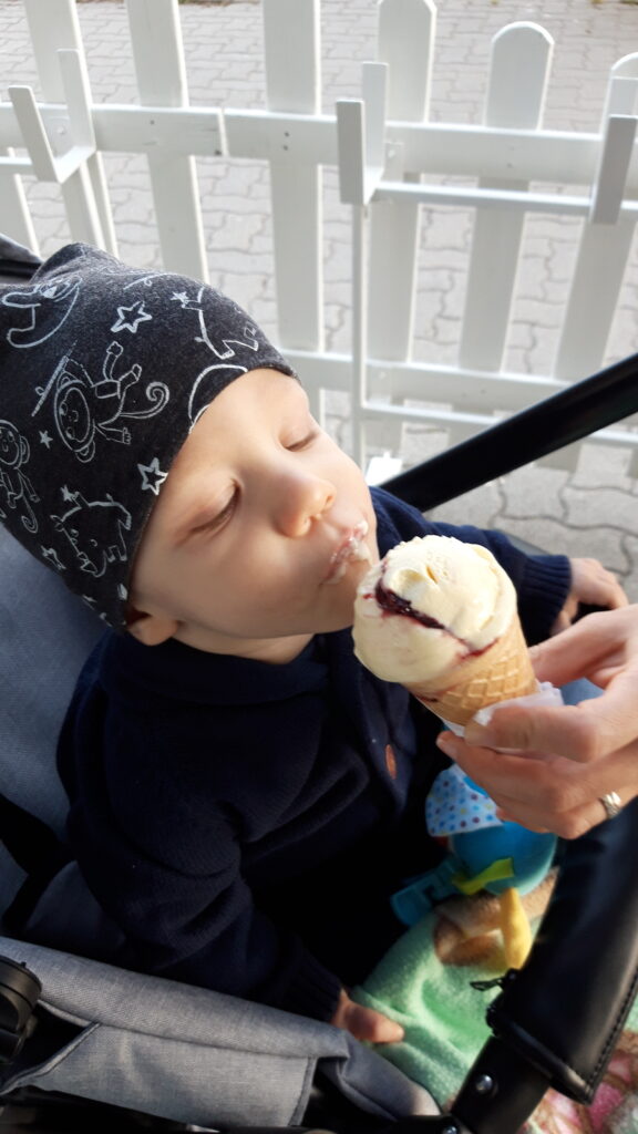 Szombaton egészen új napra ébredtünk éreztem valami történik. Apa sokszor tűnt el a csomagokkal, majd üres kézzel jött vissza. Mi is a végén lementünk a verdához. na ide kerültek a cuccok. De akkor valamerre megyünk csapatunk. Ekkor még nem tudtam milyen hosszú út elött áltunk. Bár feltűnő lehetett volna, mert induláskor Apa megitatta a fehér paripát, gondolom hogy bírja az utat. Egy ideig követtem merre járunk de aztán feladtam. Amikor felébredtem nem ismerős hely fele tartottunk. Állítólag egy boxutca kiállást muszály itt megejteni. Ha már megálltunk akkor egy kis fagyi éppen belefért. Te jó ég ezután már nem lehetett velem bírni a hátsó ülésen.