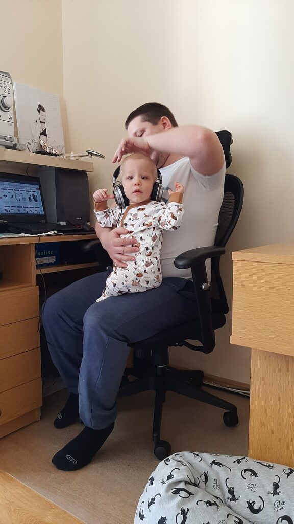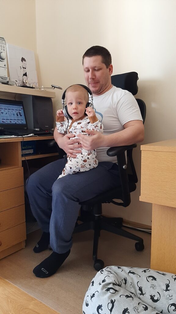 Szombaton is jó nagy alvás után ébredtem. Majd reggel bandáztam Anyával amíg Apa összeütötte a rántottát reggelire. Majd kicist mókáztunk belehallgattam Apa milyen zenét hallgat. Szerintem nekem pont jól áll a fülhallgató.