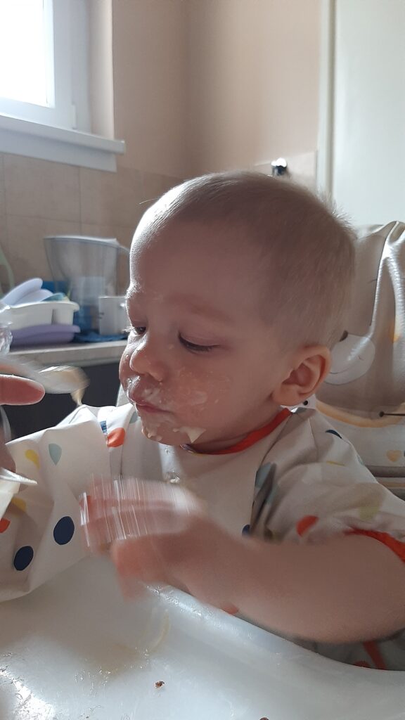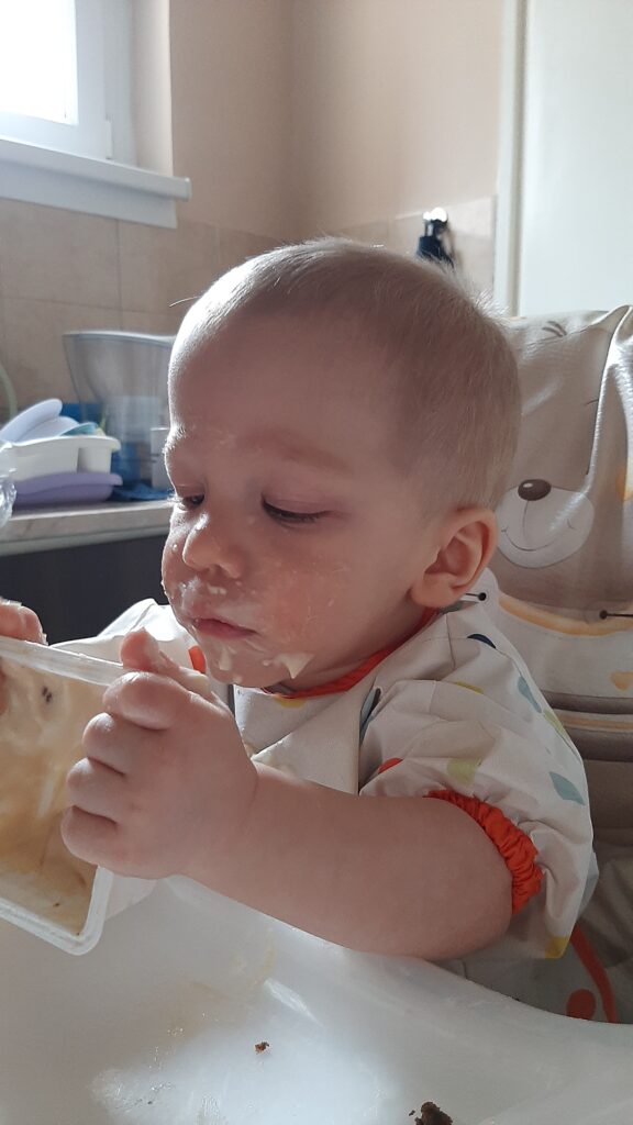 Vasárnap már ismét egy új mókázós napra ébredtünk. Apára mát kora reggel óta rácsimpaszkodtam, és nap közben sem engedtem el magamtól a látóhatáron kivülre. Reggelinél a krémtúrós dobozát kívül belülről megkóstoltam.