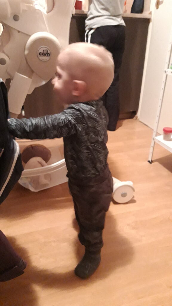 Hétfőn hajnalra virradóra olyan történt mint még eddig nem csináltam. Éjjel éreztem én Apa álom etetést csinál. Nem fogyott el az egész adagom hagytam még hajnalra is. Majd hajnalban betoltam a maradékor és rákértem még egy két kupicával. Na erre senki sem volt felkészülve. Reggel elengedtem Apát pelus pénzt keresni. Így egy könnyű reggeli után elmentünk kicsit bevásásrolni. Majd itthon jó nagyot aludtam Anyán. Délután megérkezett a pelus szállítmány így már könnyebben voltunk. Délután nem tudtunk akkora sétakört tenni mint szoktunk mert esett az eső. Így csak rövid köröket toltunk. Itthon a lakásban igyekeztem kimozogni magamat. Szerintem elég menő az új outfittem.
