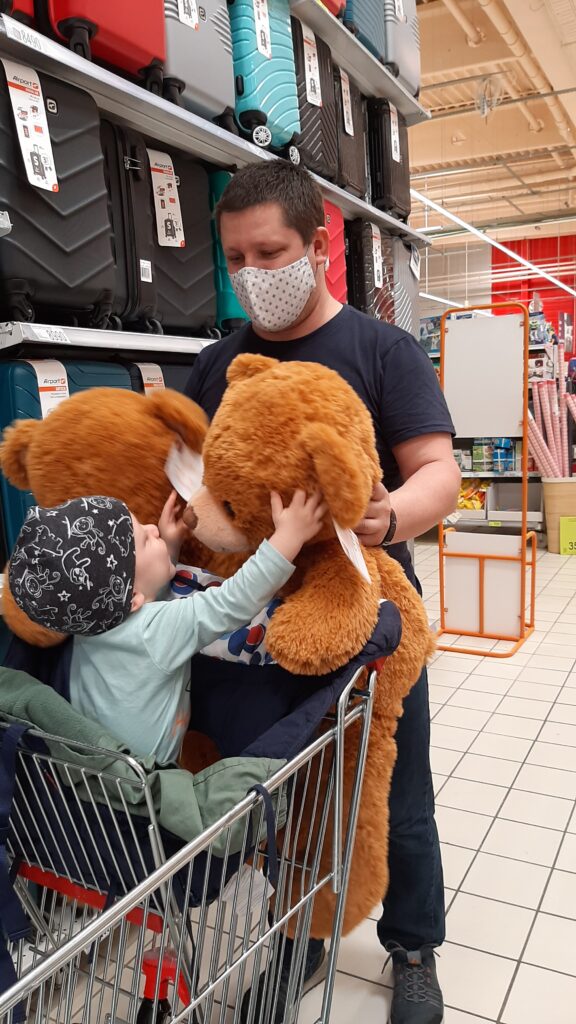 Szombaton közös vásárlással töltöttük a délelöttöt. még szerencse hogy plusz pelussal jönnek a szülök mert a bevásásrlást egy boxutca kiállással meg kellet szakítani. Teljesen jól elvoltam hol az egyik bevásárló kocsiba ültem hol a másikba. Azért élni tudni kell partiztam a medvékkel. Mert mi jobb egy nagy plüs macinál 2 plüs maci.