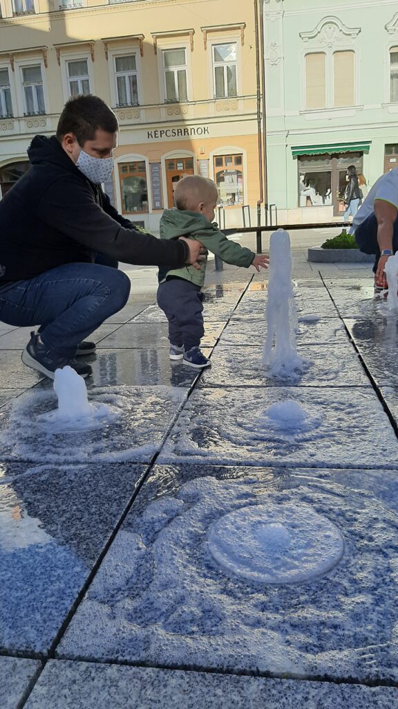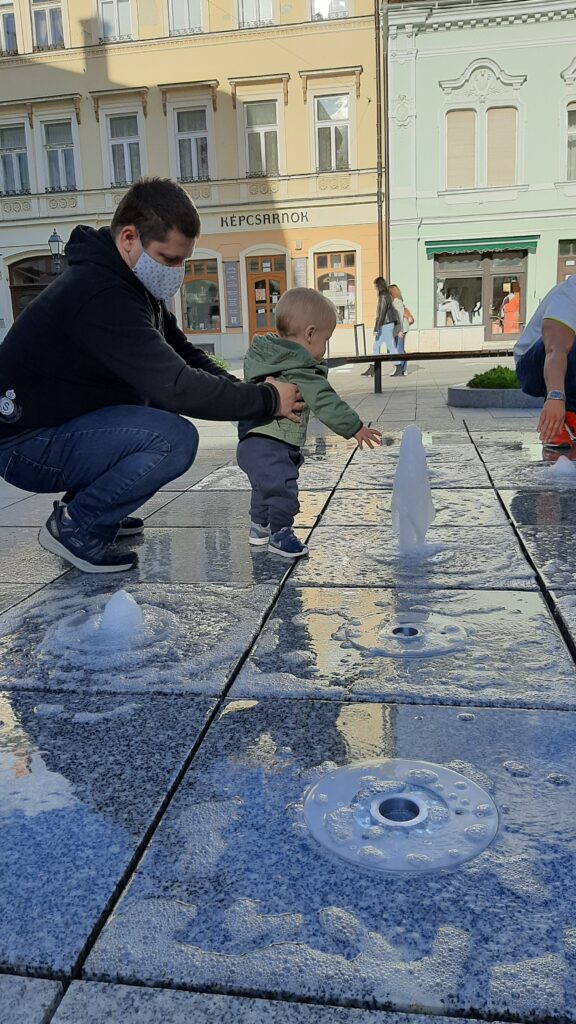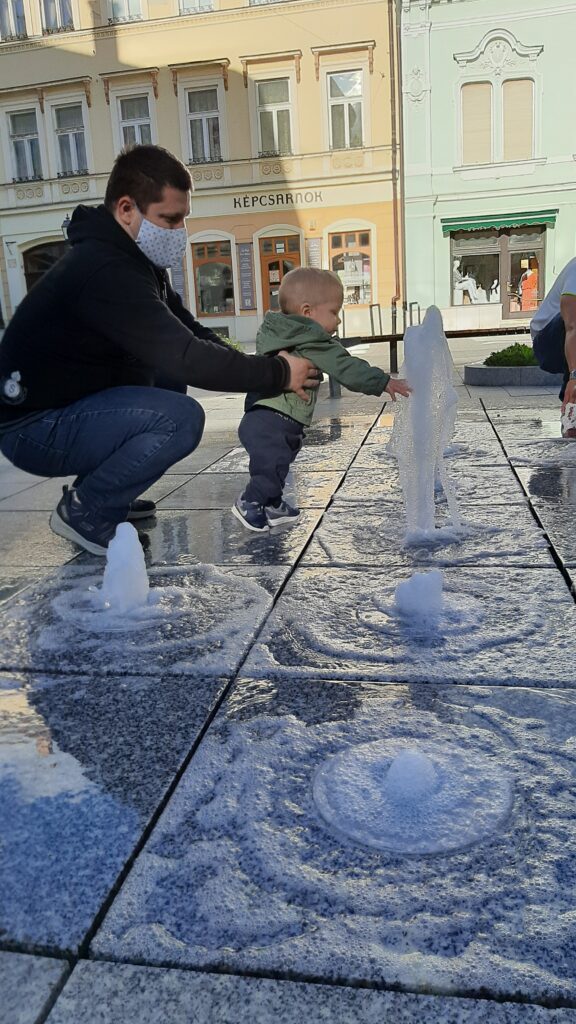 A fagylaltot egy kellemes helyen el is fogyasztottuk. Nekem nagyon bejött a vízjáték. Eddig csak távolról néztem meg, de közelebbről is szemügyre vettem. Persze most volt motíváció így Apa kezét fogva oda lépkedtem. Na kérem ez a nem semmi. Egyszer eltűnik majd megjelenik a víz.