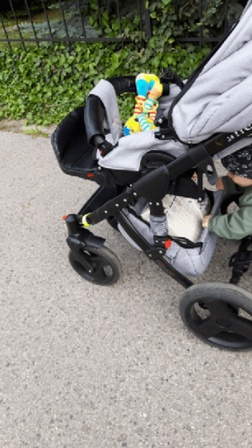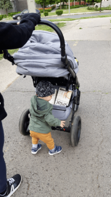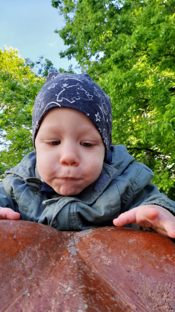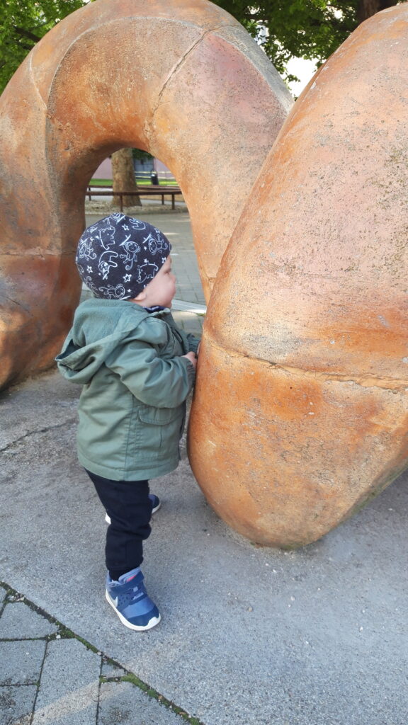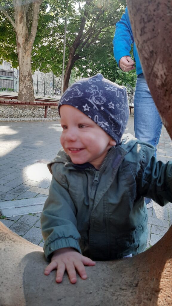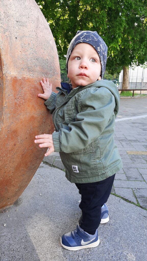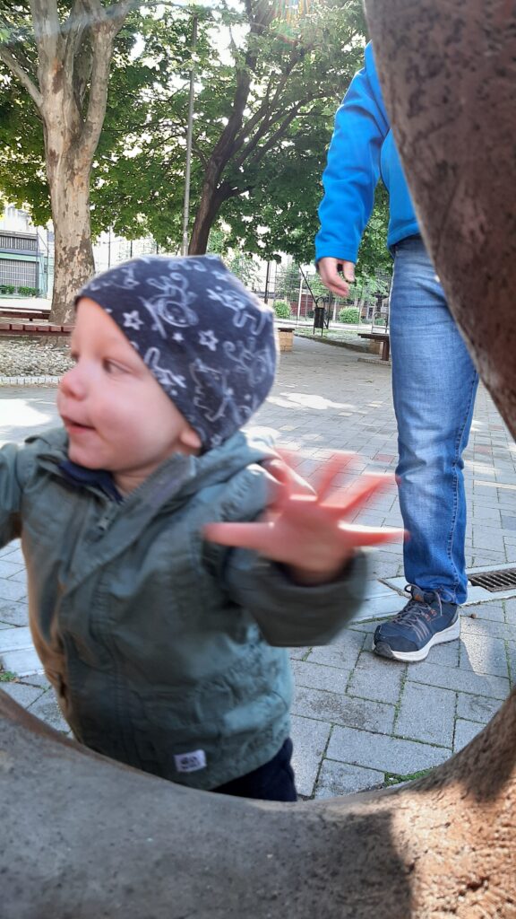 Délután vártun egy kicsit a jobb időre, majd kimanetünk megjáratni a verdát. Időközben a szülők találkoztak másik szülőkkel mi meg a saját verdánba csak néztük a másikat. Hé te ki vagy? Hazafele jól kidolgoztam magamat mert a téren áttoltam a járgányomat. Sőt ha már ott volt egy beton kígyó így körbe is jártam.