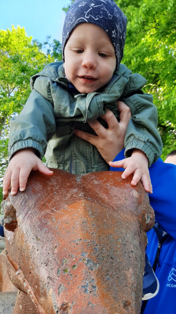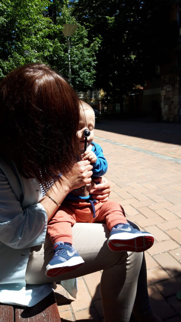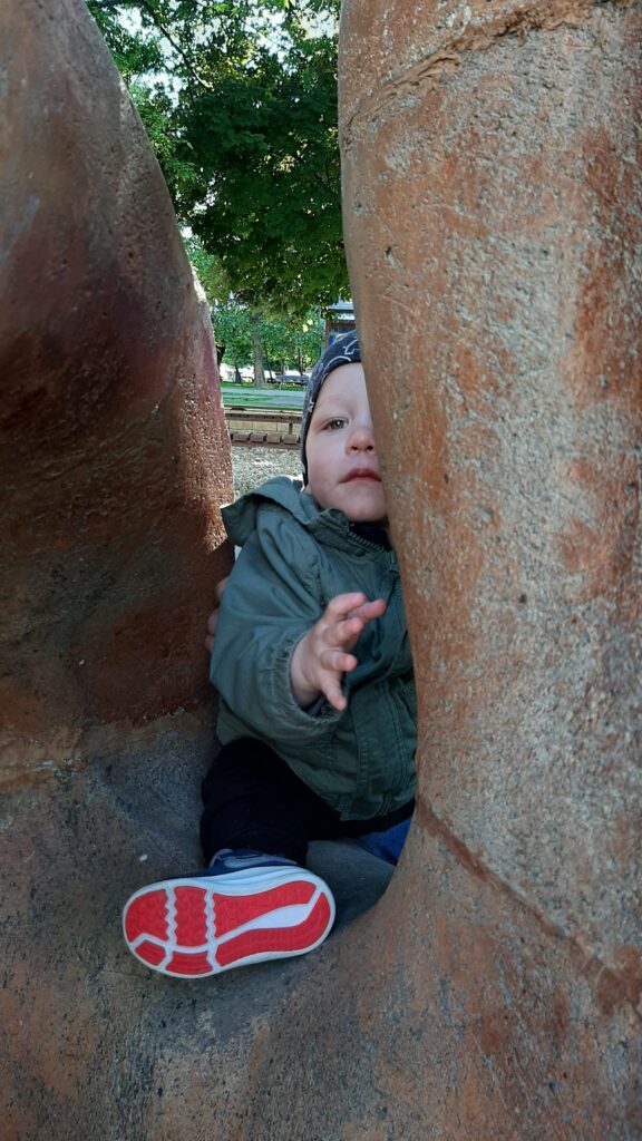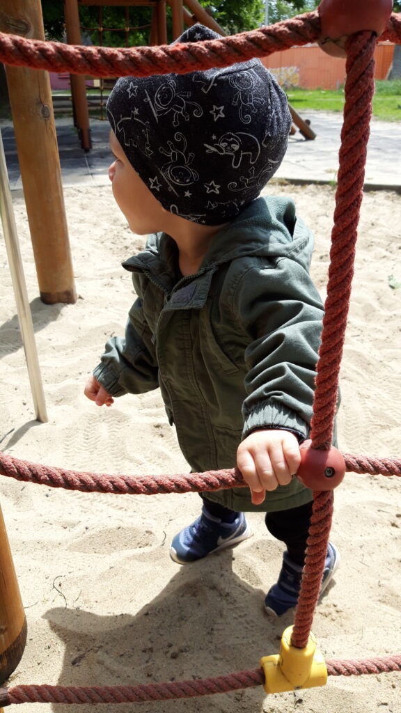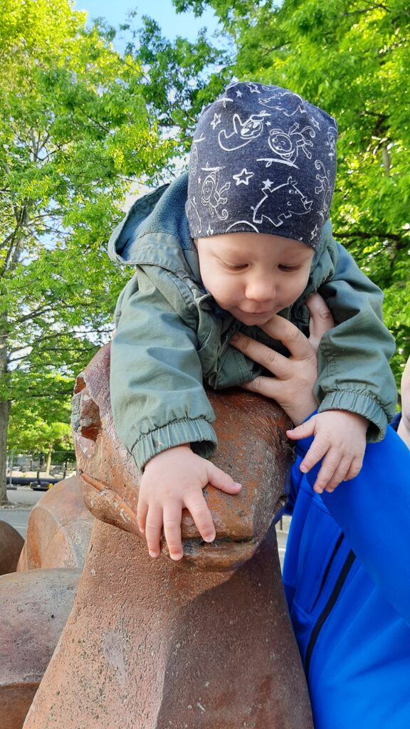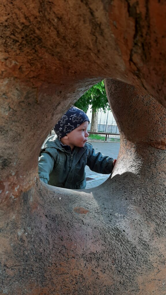 Délután vártun egy kicsit a jobb időre, majd kimanetünk megjáratni a verdát. Időközben a szülők találkoztak másik szülőkkel mi meg a saját verdánba csak néztük a másikat. Hé te ki vagy? Hazafele jól kidolgoztam magamat mert a téren áttoltam a járgányomat. Sőt ha már ott volt egy beton kígyó így körbe is jártam.
