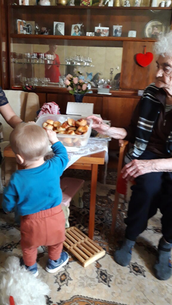 Délután visszaérve jó nagyot aludtam Apával. Majd meglátogattuk a dédit is. Megkóstoltam a pogácsáját és haverkodtam a kutyussal is.