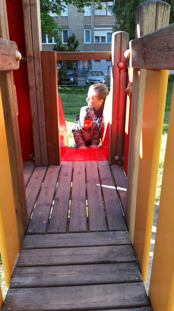 Hétfőn valami furcsaság volt Apa nem ment dolgozni. Egész nap itthon volt. Délután kimentünk a játszó térre valami készült mert játszós ruhát kaptam. Nekem se kellett több belebújtam a homokozóba. Igaz kicsit nedves volt de annál könnyebben lapátoltam.