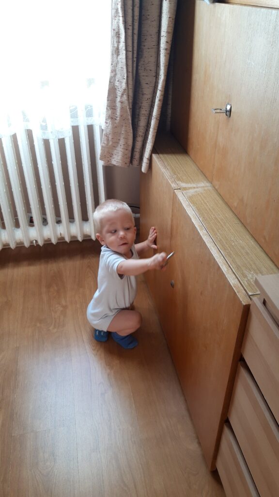 Csütörtök reggel kicsit késöbb ébredtem mint a megszokott, de Apával buliból így sem volt hiány. Igaz a reggelt eléggé minuszosan kezdtük mert fél óra alatt háromszor öltöztem át. Sebaj, ezután már rendben volt minden. A kora reggeli érdeklődésemet a kulcs használata keltette fel. Le is nyúltam a szülőktől egy szekrény kulcsot, majd először segítséggel majd később egyedül is betaláltam a zárba. Volt ám nagy öröm.