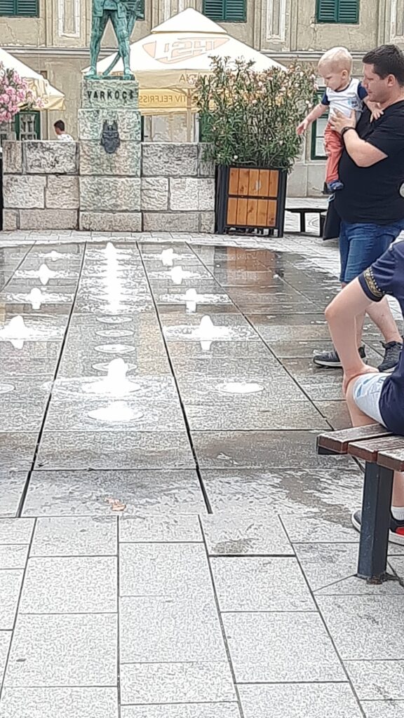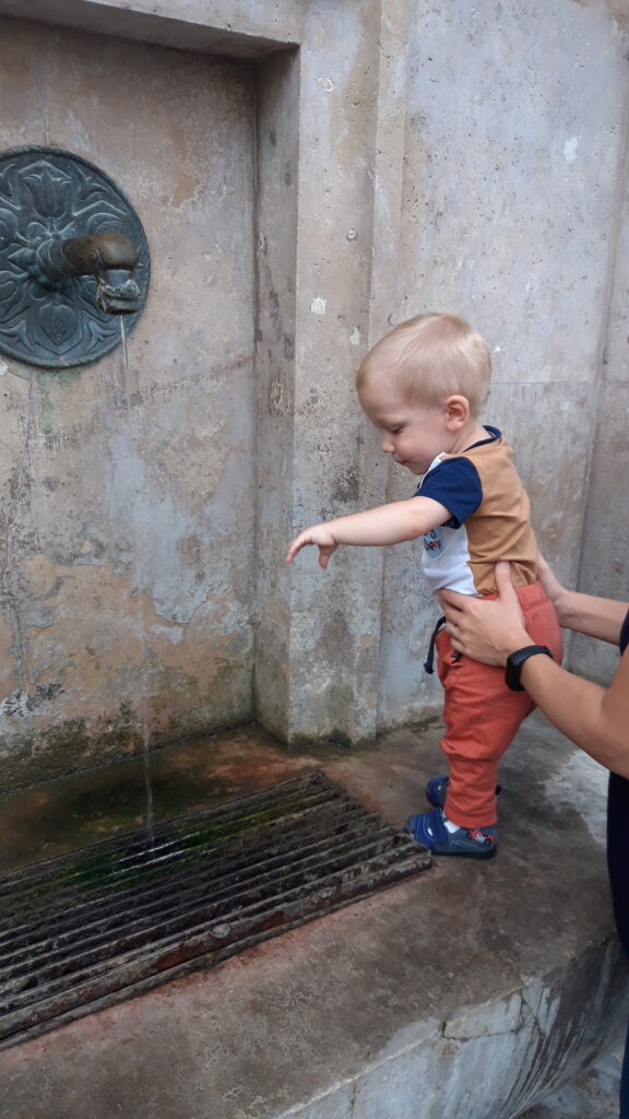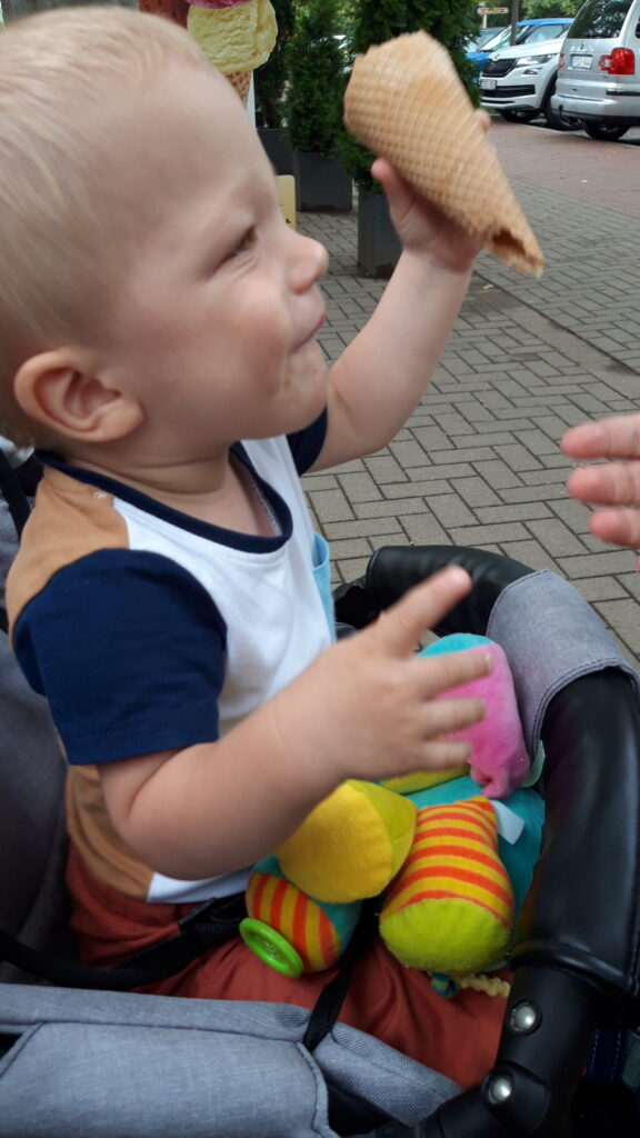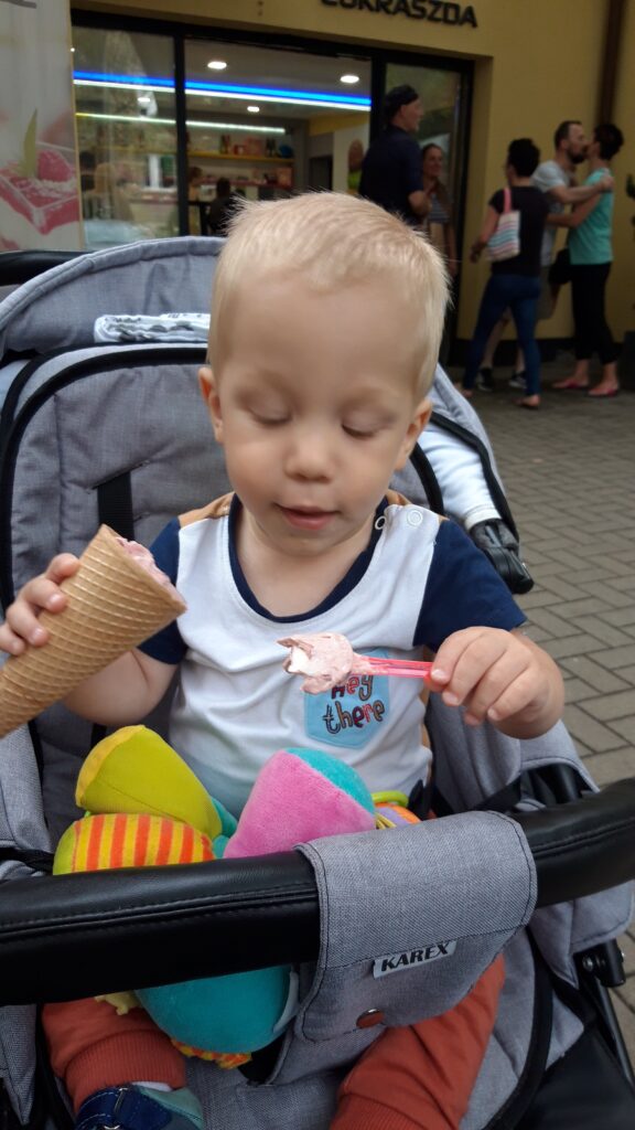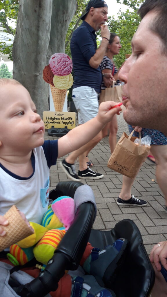 Sőt az ágytól kiszöktem a teraszra. Apát le is rendeztem valami kérdezett, de nem fogalkoztam már vele így egy „nem” válassszal otthagytam a szülőket akik cska csodálkoztak. Délután alvás után is sem voltam nagyon éhes. Viszont már idő lenne a játszótérre, nosza vegyük is fel a szandit és indulás. Most a szép utcai szandélomba indultunk el. Ohho ez azt jelenti nem a jétszótér lesz a célpont. Jó nagyot sétáltunk a belvárosban. Fagyiztunk és a szökőkutat is megnéztük.