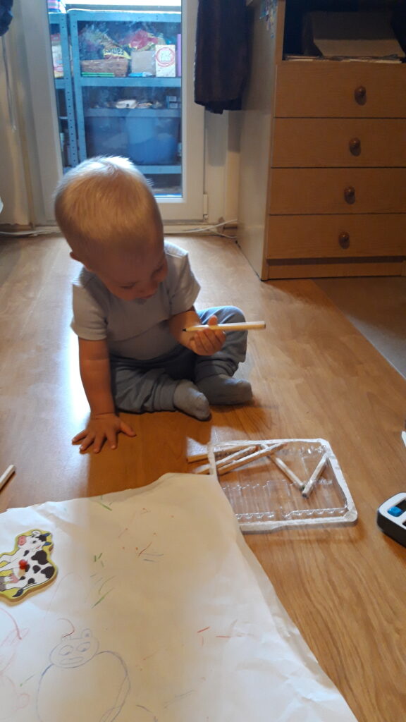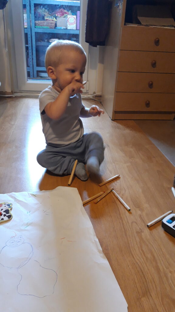 A kreatív feladatokat is én oldom meg tegnap óta már papírt is kaptam ahol rajzolhatok a ceruzákkal. Jelentem jó íze van a ceruzának is.