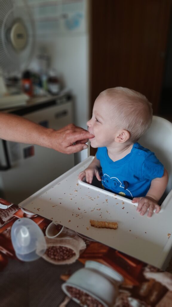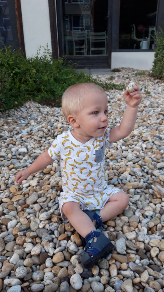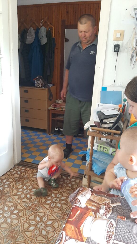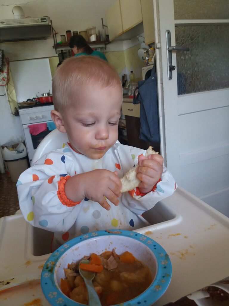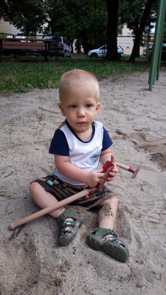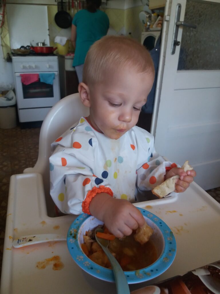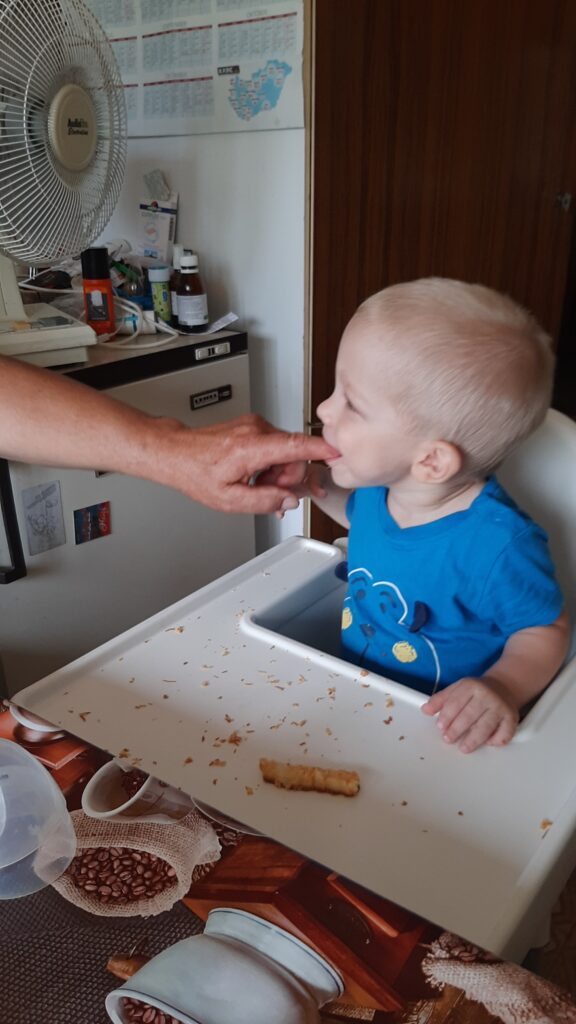 Vasárnap reggel korán ébredtem és már mentem is volna ki a szabadba de a szülők még csendes pihenőt rendeltek el. nagyon nem tetszett ez nekem. Végül is mindenki felébredt így engedélyt kaptam a kinn tartózkodásra. De elötte reggel még beköszöntem a nagypapihoz éppen borotválkozott ezért nem rontottam rá csak megvártam hogy végez és akkor szóltam neki. Reggelire Anya rántotát készítet na ebből én is ettem mert, a homokozás teljes baba testet kíván ide kell ám az erő. A délelött töbször is szemügyre vettem a jószág állományt. Sajnos a szemlevételezést néha az eső megszakította a szülők meg nem engedtek ki a vizes fűbe a szép szandimmal. Délelött még mókáztam a papival, az újjával összeszedte a süti darabokat, azt hitte azt eszem meg, de nem az újj kellett..