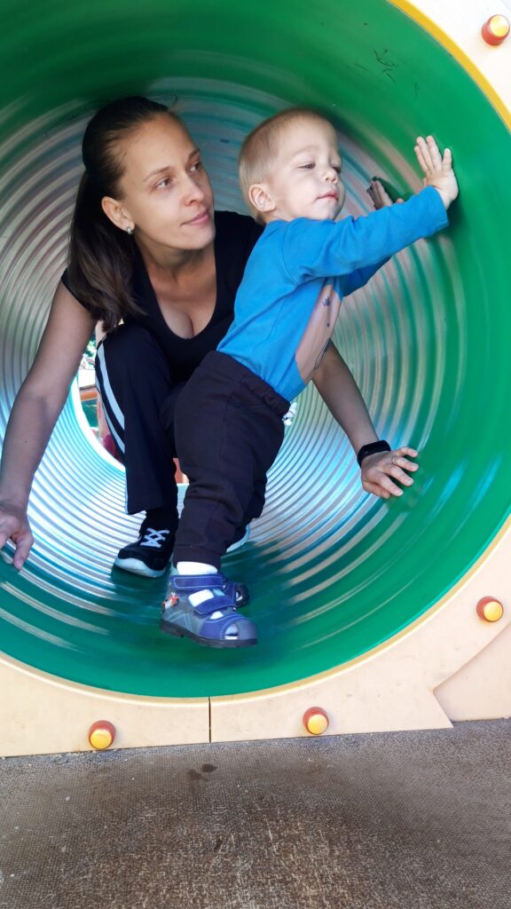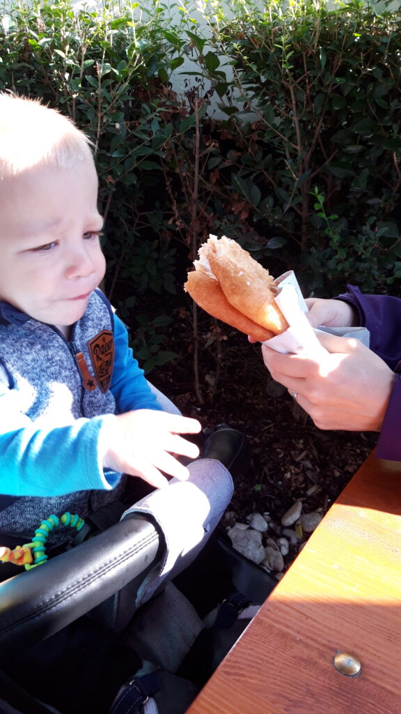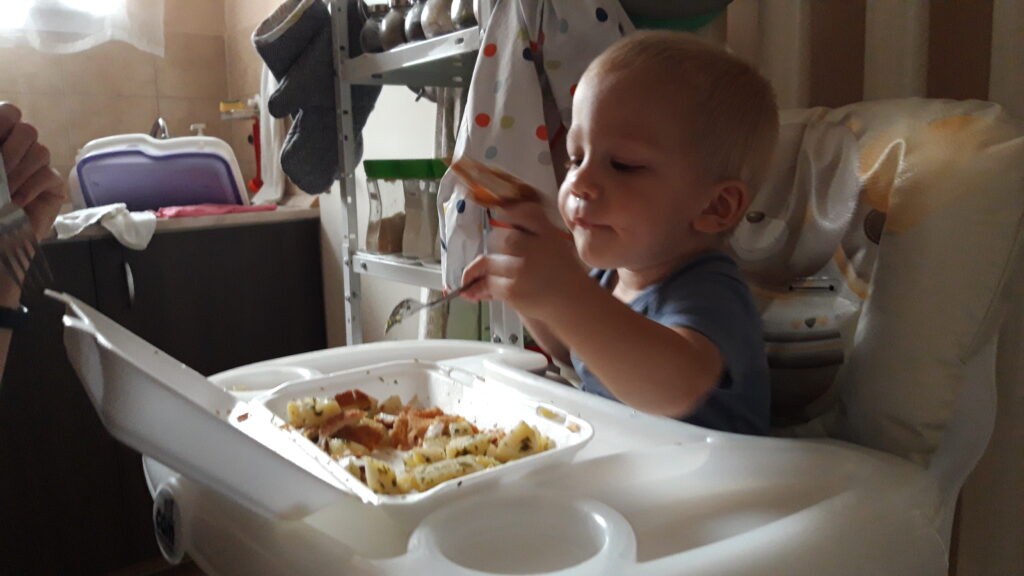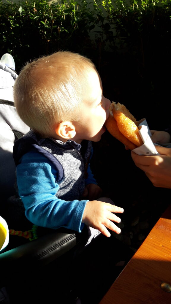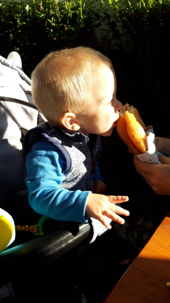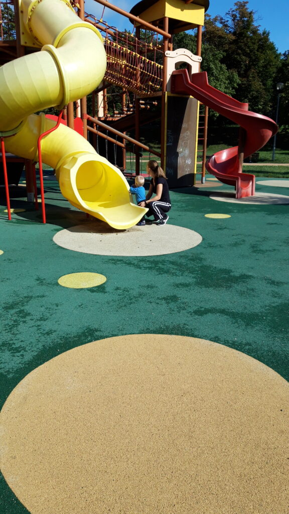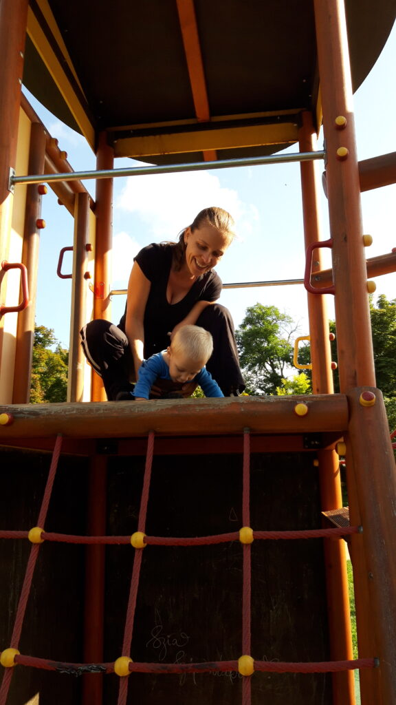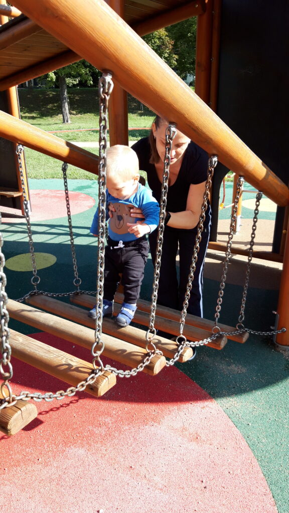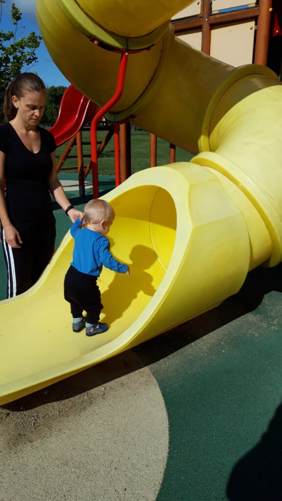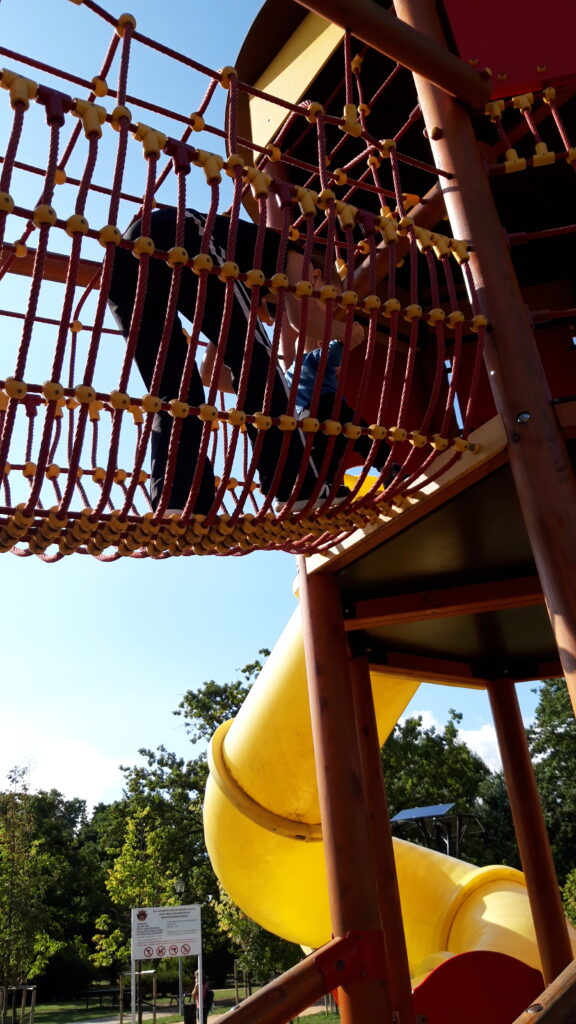 Na erre nem tudok nemet mondani. Így Anya adagájából és az Apáéból is csipegettem egy keveset. Majd a közeli nagy parkban mókáztunk. Ma már mnagyiú voltam és hullámos csúszdán is lecsústma, illetve a nagy csúszdákon is anya ölében.