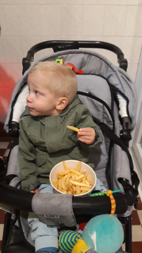 Visszafele egy rég nem látogatott parkban bandáztunk. kipróbáltunk mindeneféle edős gépeket. Hazafele vettünk nekem sült krumplit.