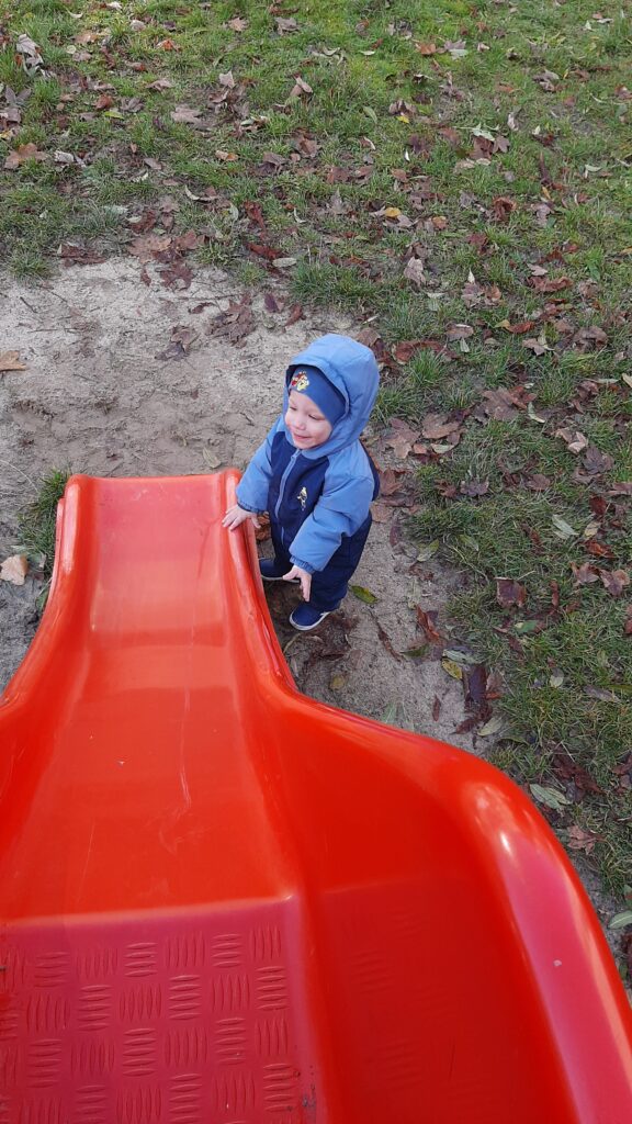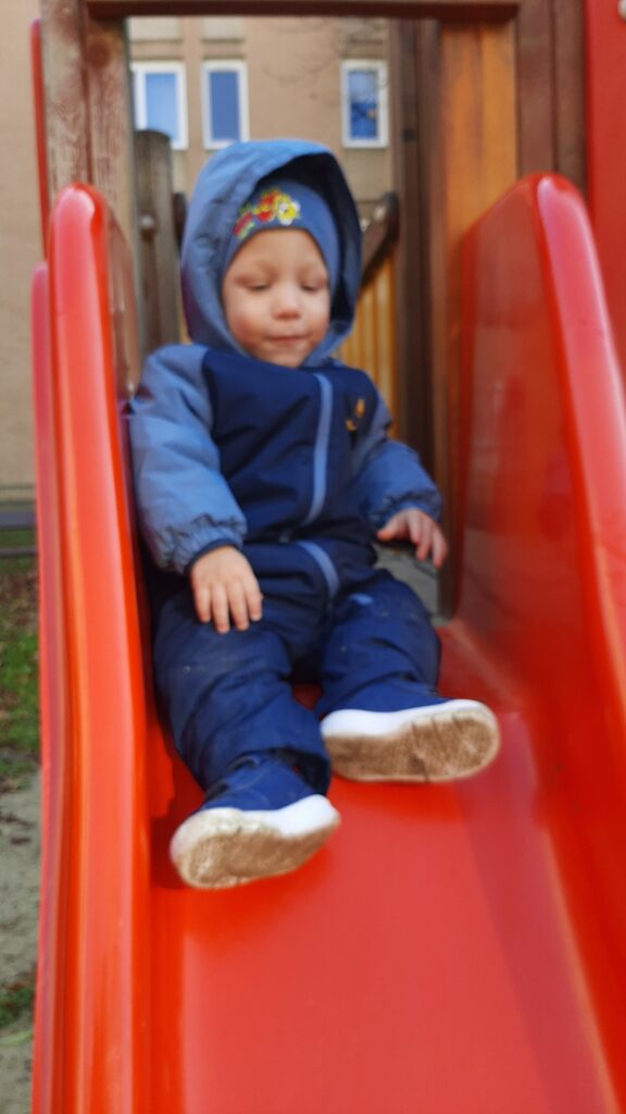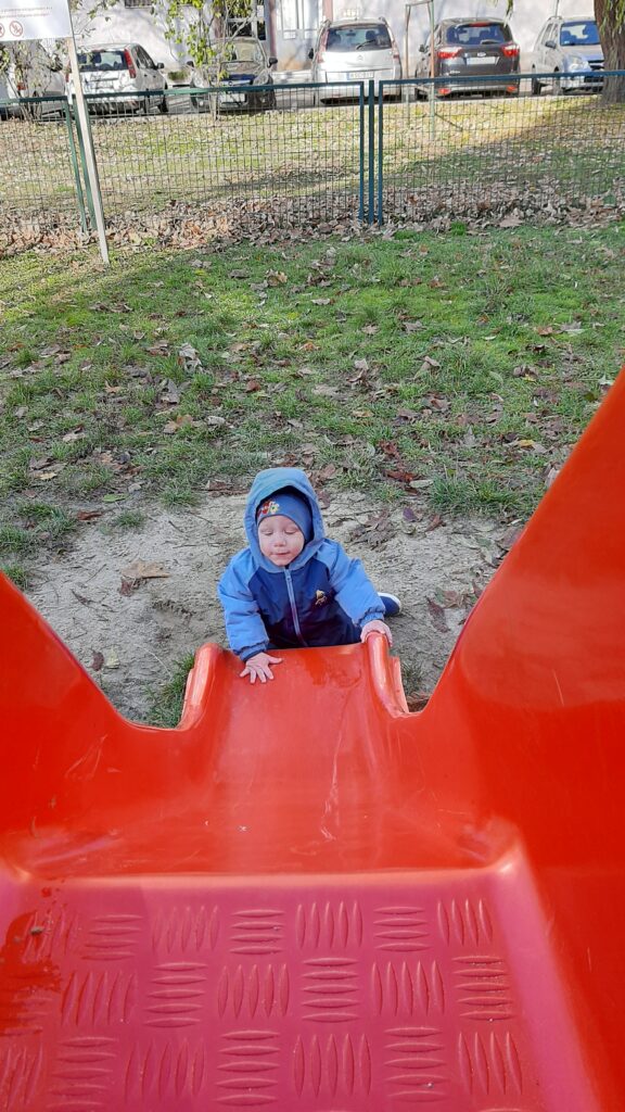 Pénteken reggel elengettük Apát dolgozni, majd mi reggeli után elindultunk egy jó nagy sétára. Hosszan gurultunk a verdával. Még szerencsére hogy nem a baba taximmal jöttem le mert elkopott volna a cipőm. Végül jó sok új dolgot láttunk. Hazafele már lejtett a pálya így gyorsabban hazaértünk. Jó is volt mert már nagyon untam a verdát és a játszótéren kimozoghattam magamat. Persze Anyát sem hagytam pihenni ha én csúsztam a csúszdán akkor neki is kellett.