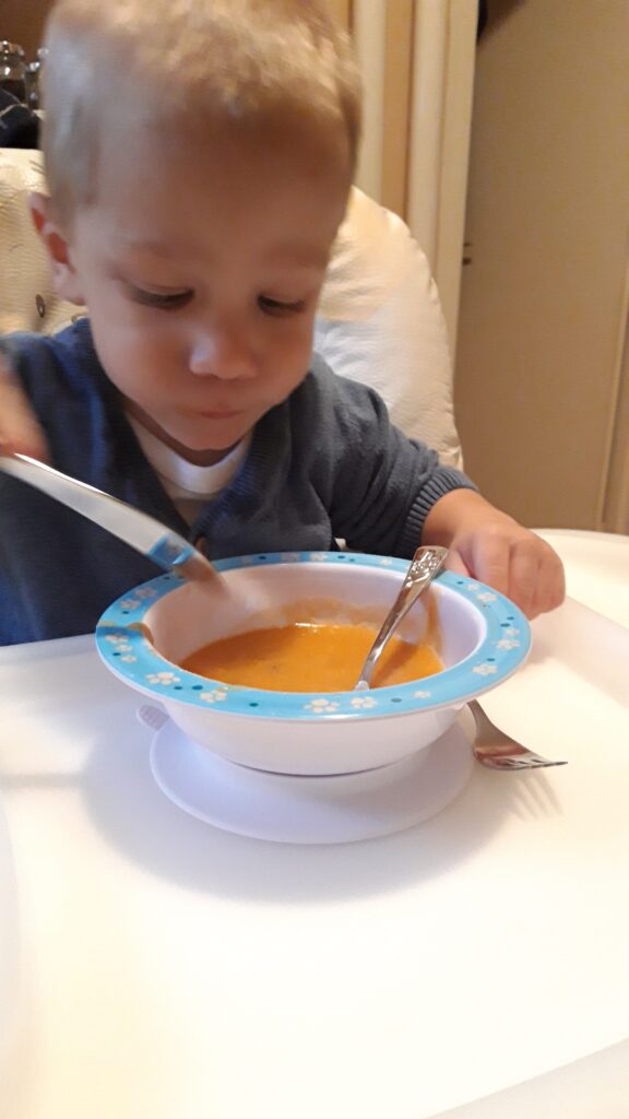 A bevsásáslás közepette ide oda bementünk, én meg nem győztem rendet rakni a bolokban semmi sem úgy volt ahogy szerettem volna. Az egyik boltban Any és Apa ismerősével találkoztunk majd jól bemutatkoztam nekik. Kellett egy kis idő mire feloldódtam de utána már pajtik voltak a nénik. Főleg az idősebbn néni kokettált velem. Apa vállán keresztül én meg mosolygtam felé. De már nehezen bírtam a vásárlást éhes voltam. Szerencsére a szülők is ezt gondolták, így beszereztük az ebédet és itthon farkas éhesen neki estem a sütőtök levesnek, majd ettem Anyának a gyümölcs leveséből, és a brassóiából is meg Apa borsó főzelékéből és fasirtjából is.