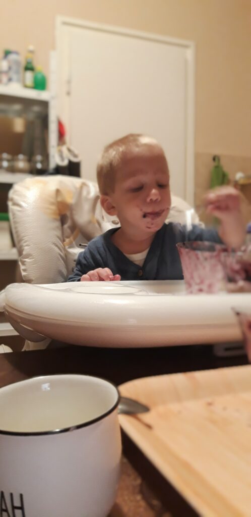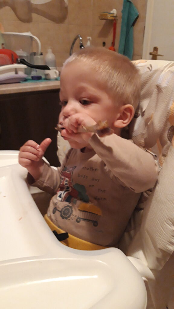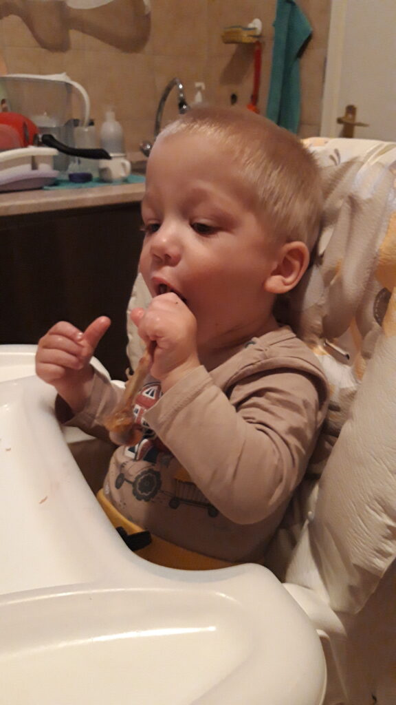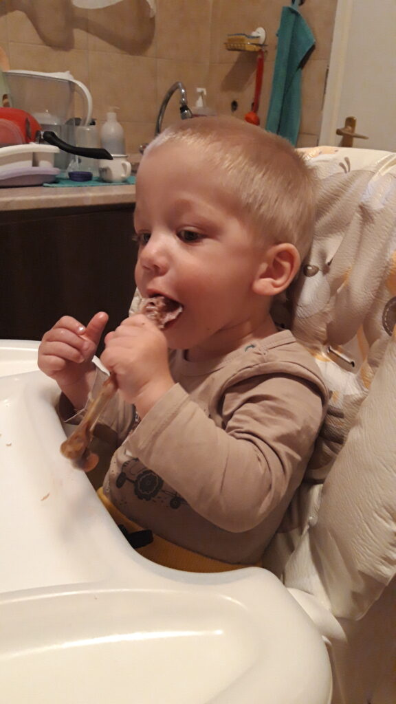 Hazafele már éhes voltam így nehezen ment a kenyér hajtású taxi is. Pedig még levámoltuk a bádog tehetent is. most extra mennyiségű tejet vételeztünk. Végül is vacsora után egy gyors fürdést követően nem kellett ringatni.