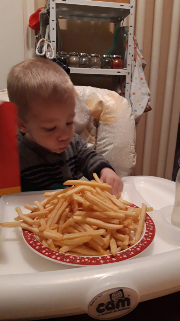 Reggelinél nem nagyon voltam éhes, aztán a tízórait is elbóhockodtam emiatt ebédre teljesen ki voltam. Már nagyon kellett az ebéd csaptam is jó nagy hisztit értem. Úgy volt kényelmes Anya karjában ülve Apa etetett. Jól belakmárortam a riszből és a husiból. Majd jó nagyot aludtam a szülőkkel. Mire felébredtem hiába kerestem a nagynénit és a nagyit eltűntek. Most én kivel folytatom a főzős játékomat? Az esti sétánál elmentünk a bocis autóhoz, feltankoltunk jól a tejkészletet. Maj hazafele sültkrumpli állományt is beszereztünk.