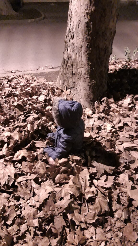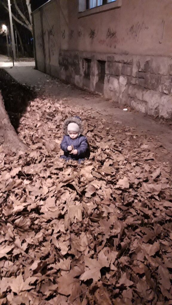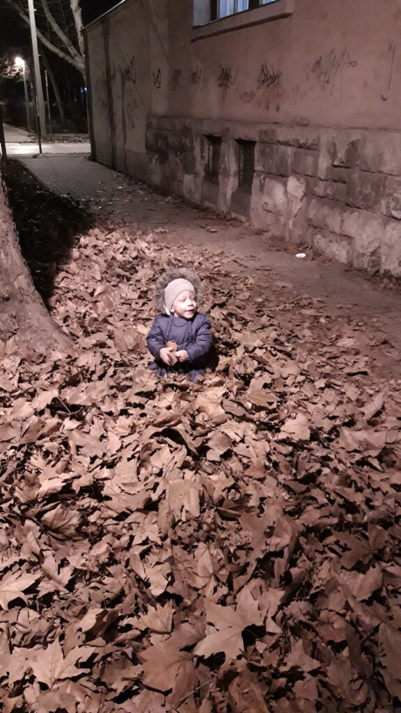 Hazafele megpihentem a falevél rakásban. Majd vacsira elött játék.fürdés alvás.