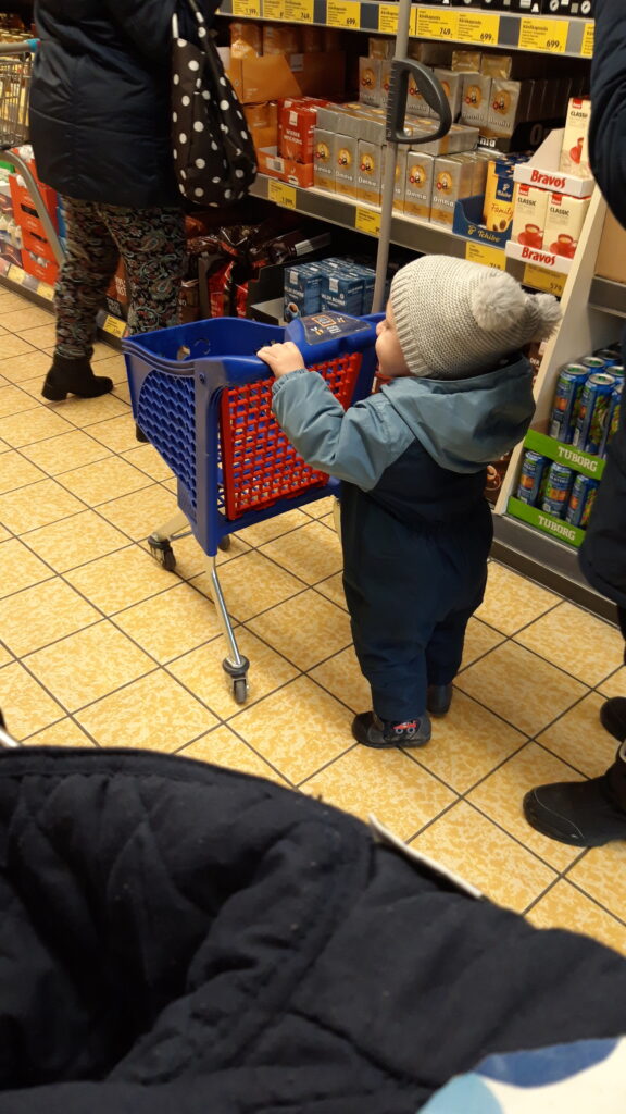 Csütörtökön délelött elindultunk bevásárolni. Mivel én már eléggé Önálló személyiség vagyok saját bevásárló kosarat kaptam.