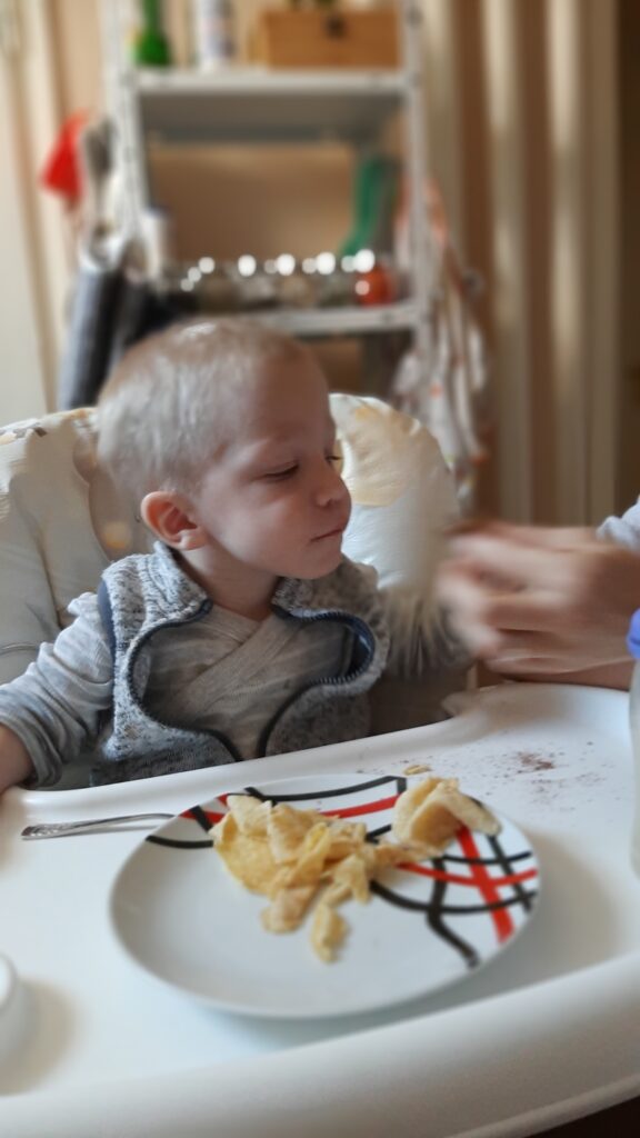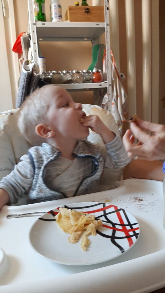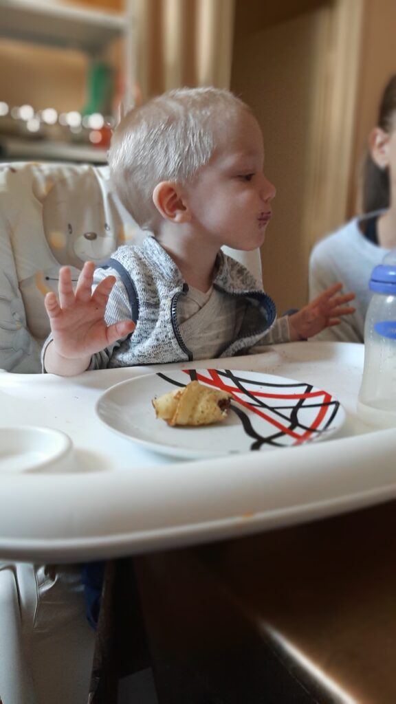 Éppen ebédre haza is értünk. Már jól esett mert éhes és szomjas is voltam. Anya új levest készített nekünk amit jóízűen fogyasztottunk. Nekem nagy feladatom volt a kutyus találjam meg a tányér alján. Nem mondom nem volt kis feladat de megoldottuk. ettünk fő ételt is majd jöhetett a desszert. Állítólag palacsinának hívták. Legyen bármi ez a tészta finom főleg a hézi erdei gyümölcsös lekvárral.