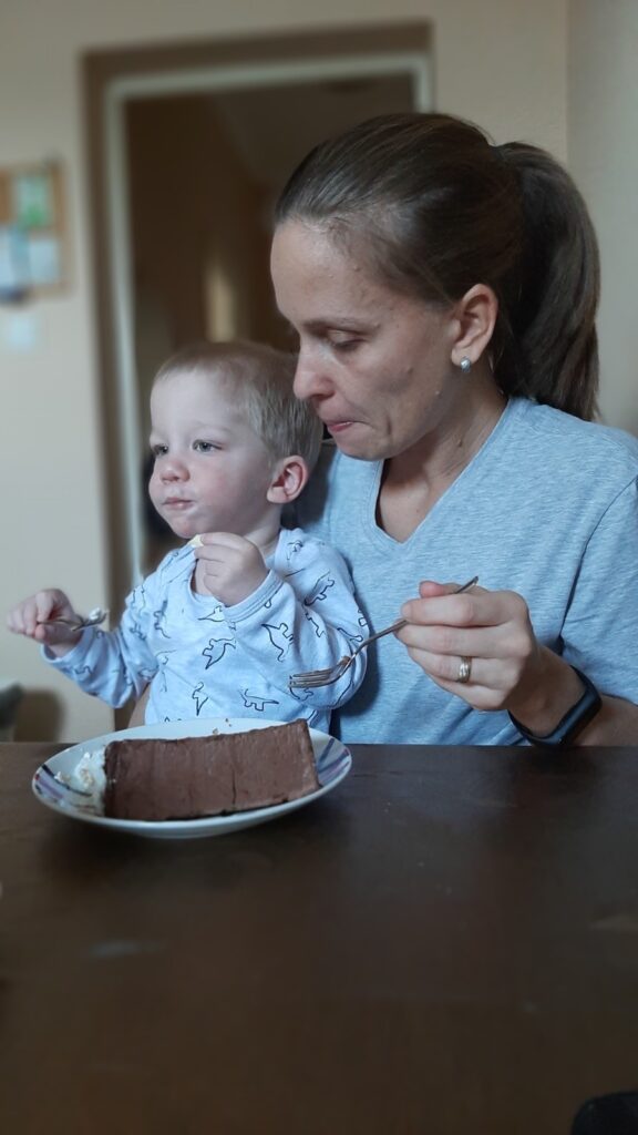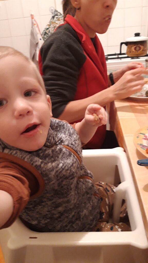 Az egész délutános mozgástól estére megéheztem megkóstoltam a madár láttam kalácsot és a hazai lekvárt. Nem is kellett több jól is esett. Az esti hajmosás még nem ment zökkenőmentesen de már kezdek vissza szokni a régi dolgokhoz. Estére már nem Apán aludtam el hanem a kiságyamba kértem magamat öltözés után. A fogmosást is itt ejtettem meg. Megyek is aludni mindenkinek szép álmokat.