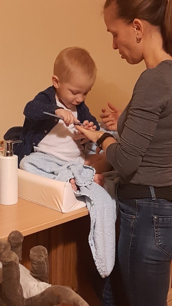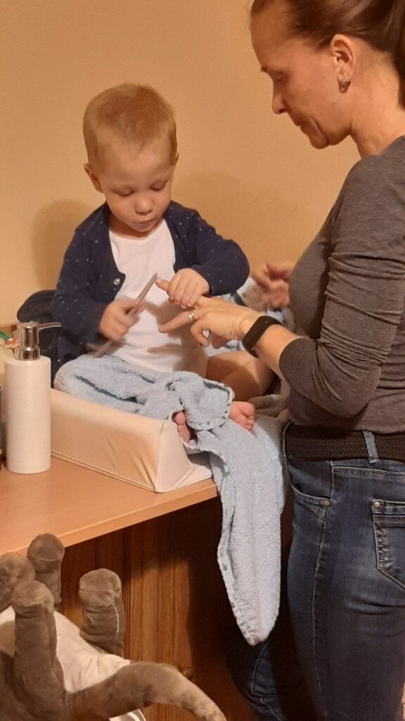 Az esti fürdés után nem engedtem hogy Anya reszelje a kezemet majd én reszelem az Ővét. Így is lett. A nagy munka után jól elfáradtam.
