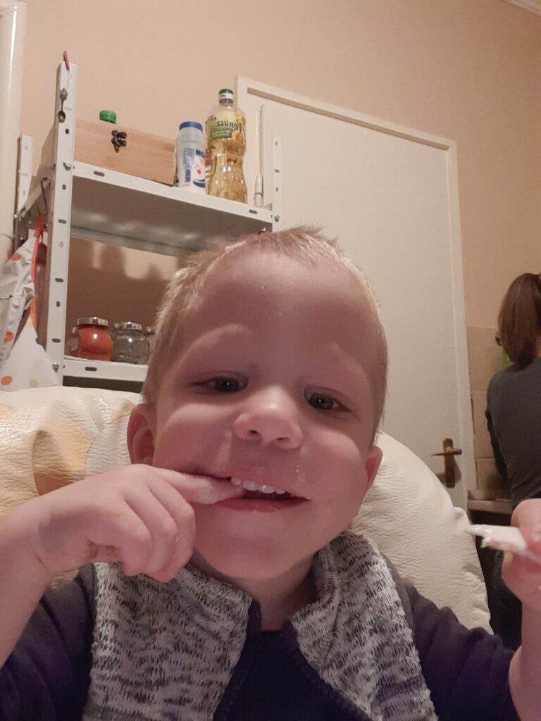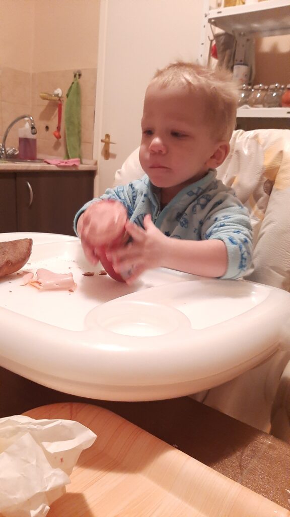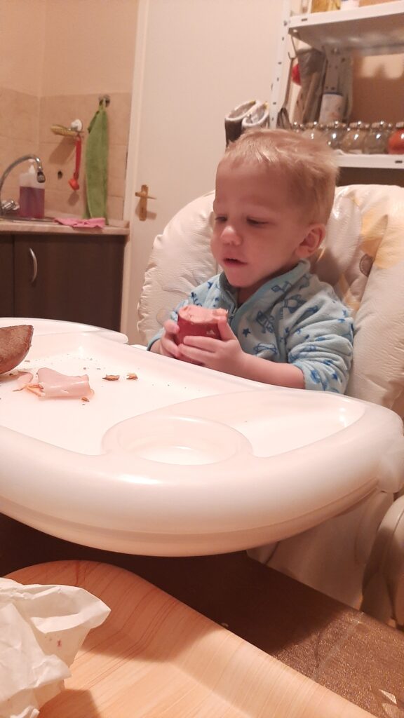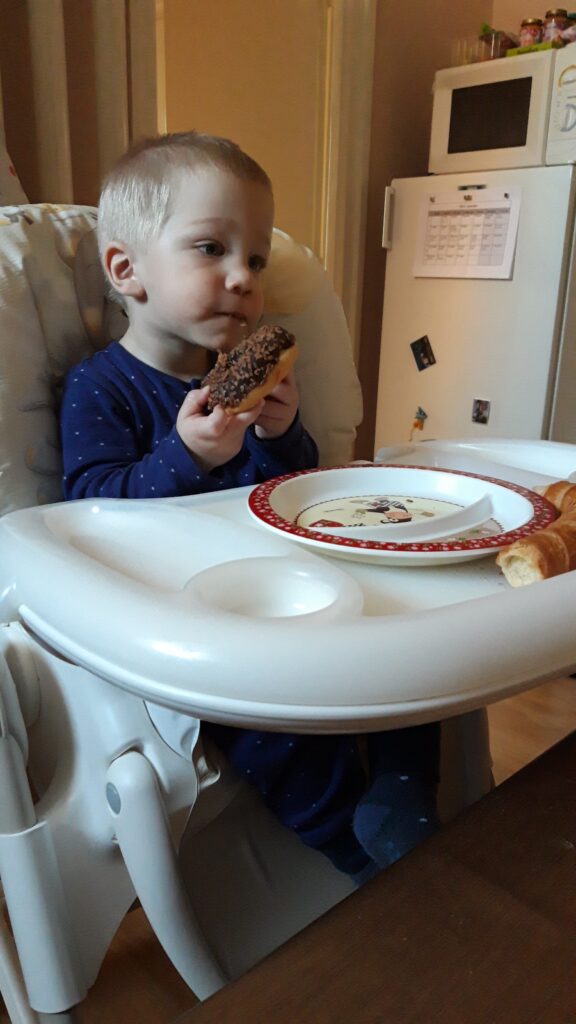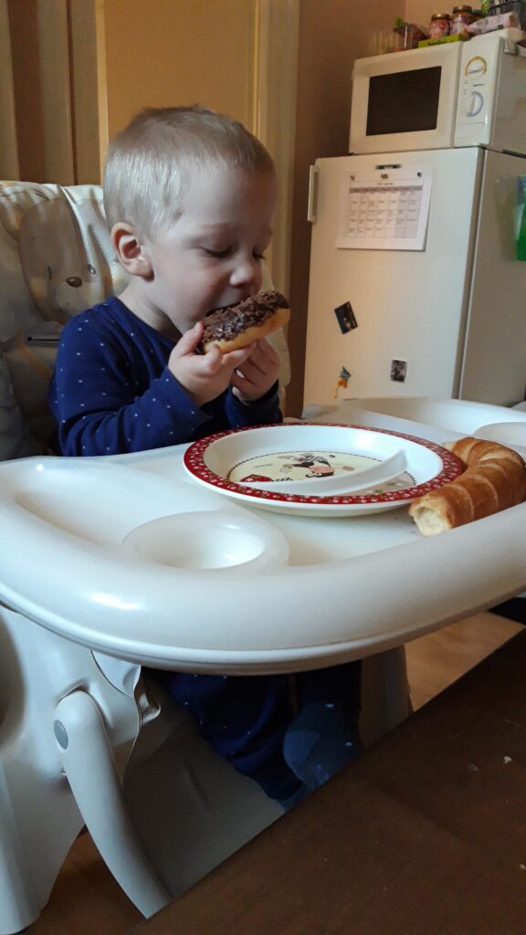 Vasárnapi reggelire Anya elkészítette a meleg szendvicset. Toltam is be rendesen. Majd a fánkból is leettem a csokis részeket.