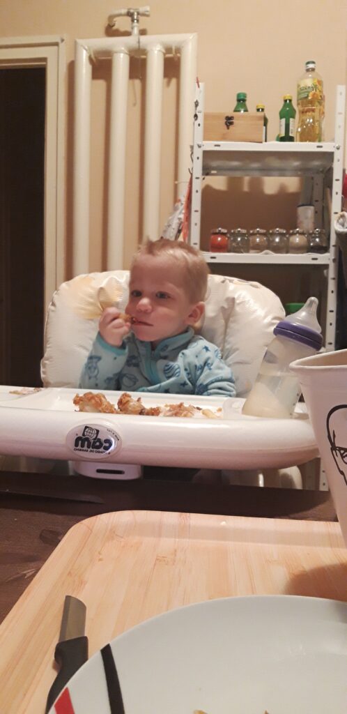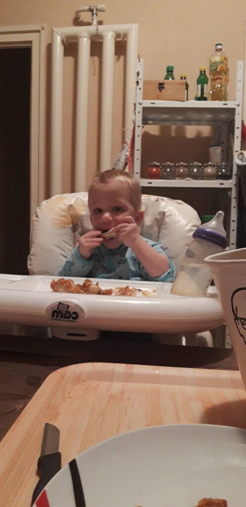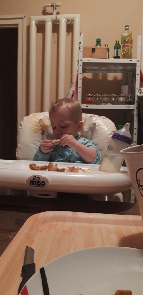 Az esti vacsoránál még mindíg a bundás csírkére voltam ráállva. Apának nem győztem adni a feladatot hogy vegye le a bundát, nekem csak a husi kell.