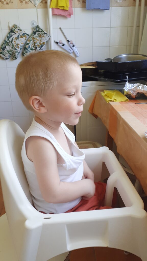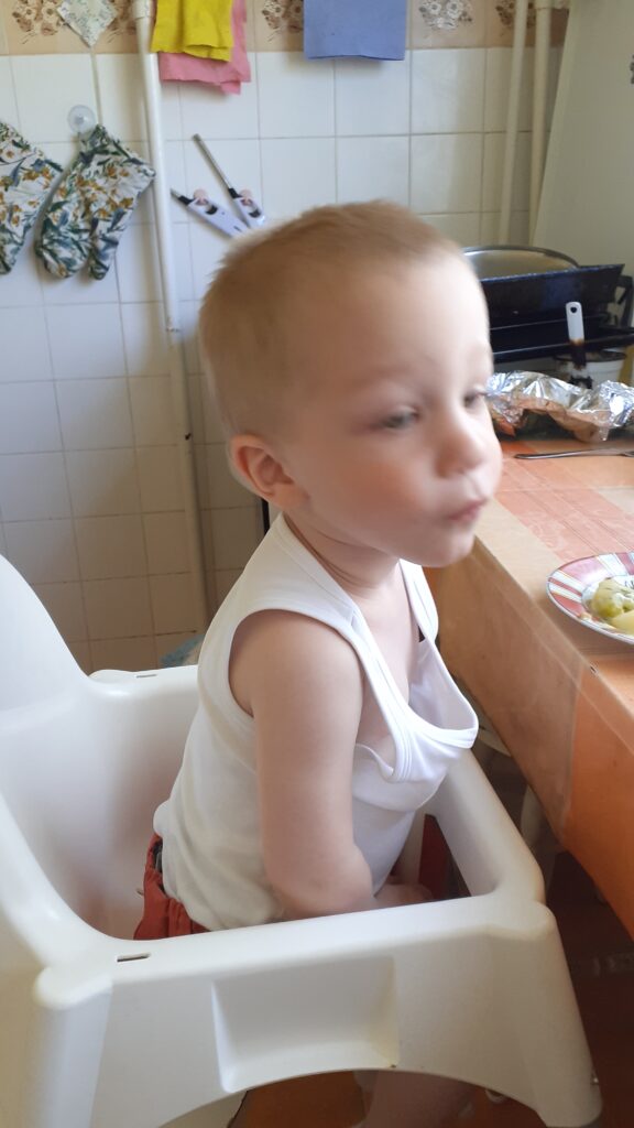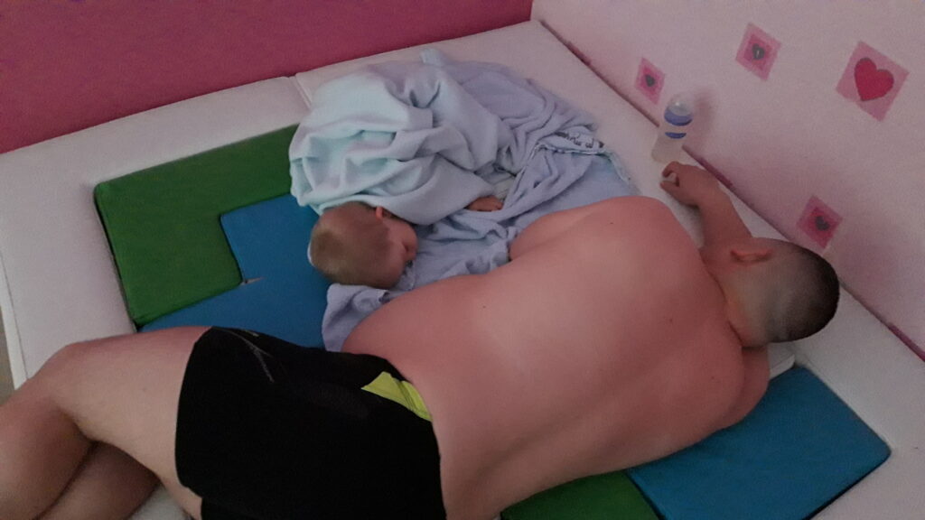 Sőt még kézenfogva mentem be a doktor bácsihoz is, na de miután becsukták az ajtót azután kezdtem el csak sirni. Szerencsére nem sokat voltunk benn. A doki bácsi minden rendben talált. Apa is elmondta milyen a napi rutinunk, hogyan szoktunk tisztálkodni. Végül elköszöntem a korháztól, pá-pá majd késő össze újra találkozunk. Ezután elindultunk a mamához és a nónához. Út közben hadi ellátást vettünk fel. Megérrkezés után gyors ebéd majd lassú alvás.