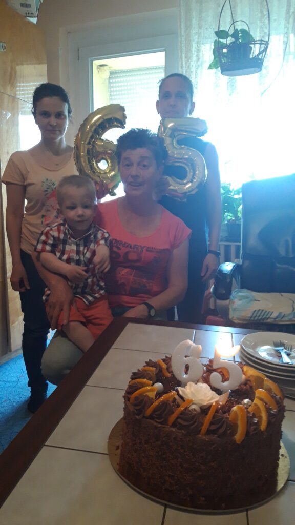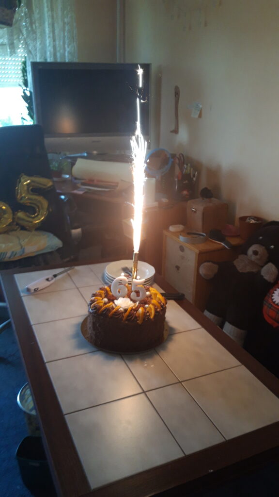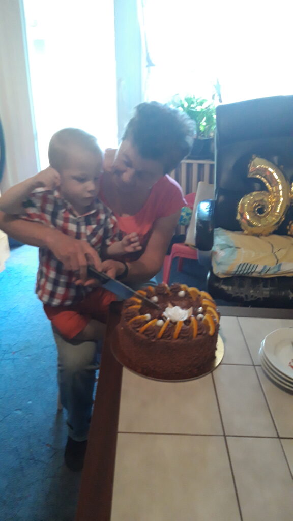 Apa dörmögésére sikerült elaludni. Amúgy is fáradt voltam. Ébredés után elmentünk bevásásrolni, Apát otthon hagytuk rendezze csak el nekem a fekhelyemet. Mire vissza értünk volt ám nagy meglepetés. A nagyinak előbukkant torta és a gyetya is. Volt ám nagy öröm és boldogság. A tortából és is kaptam finom falatokat.