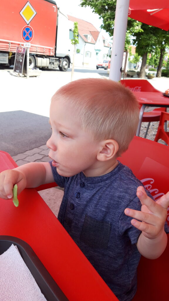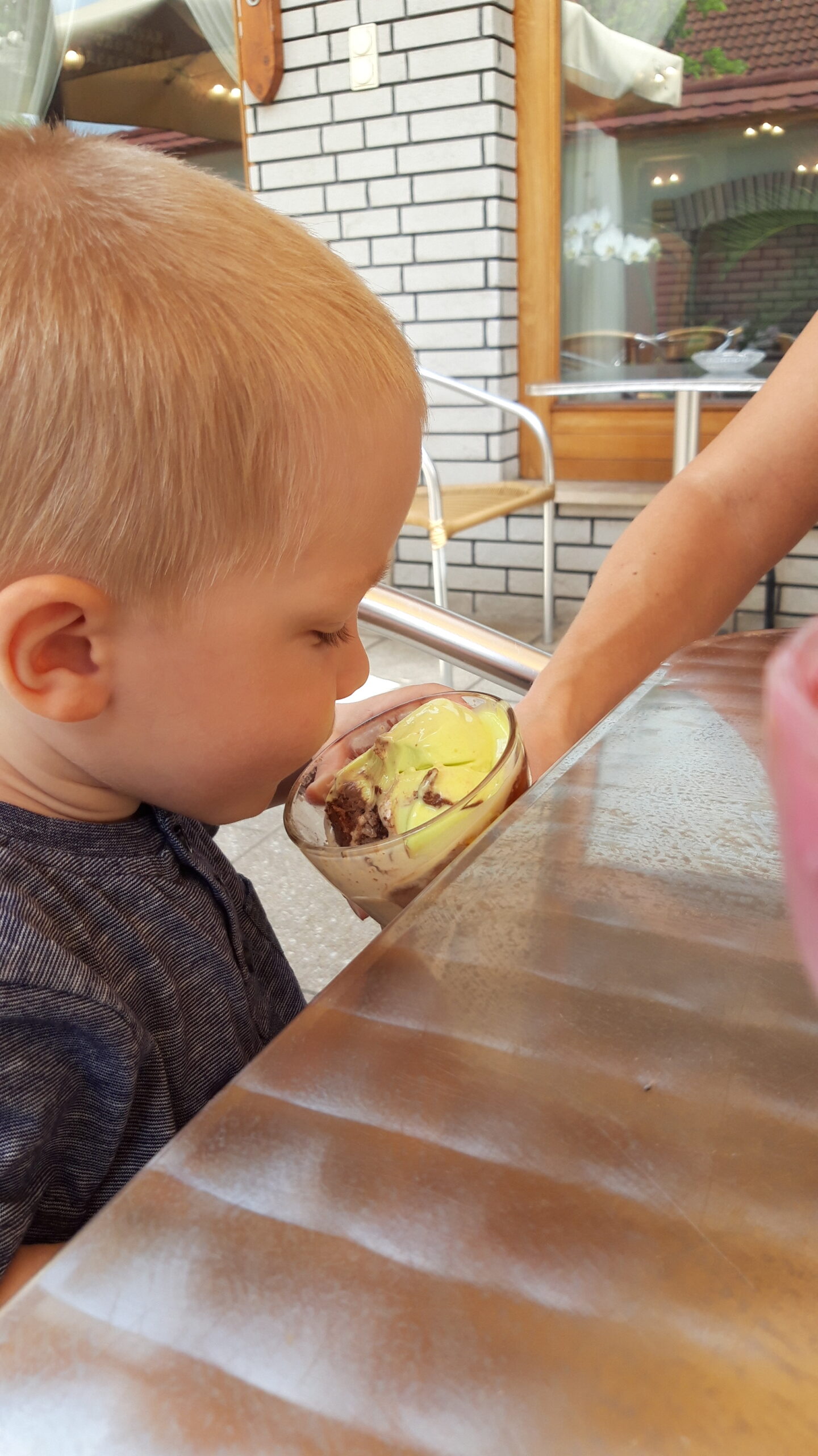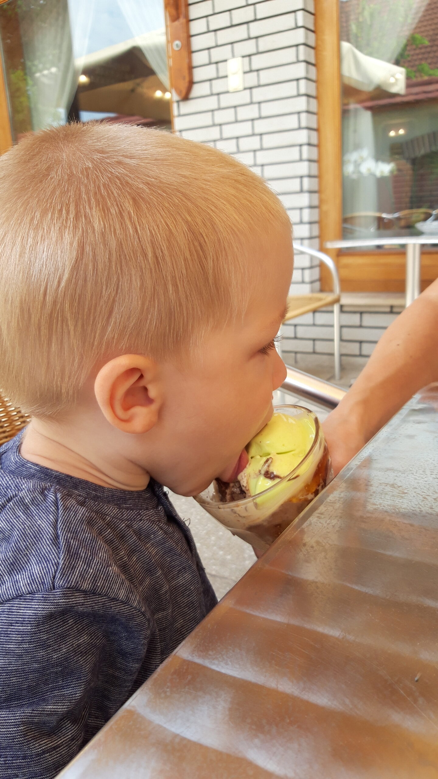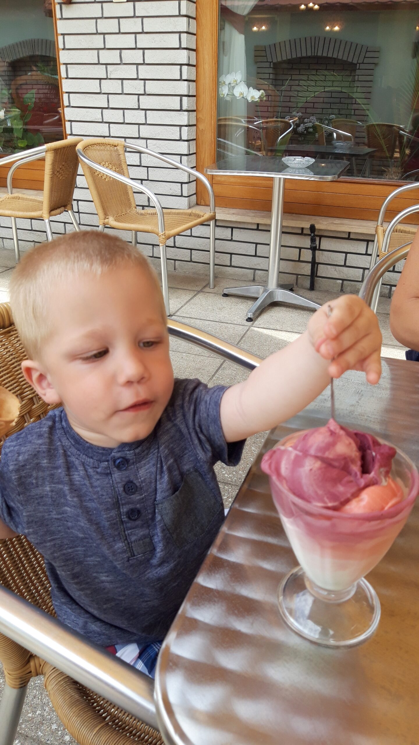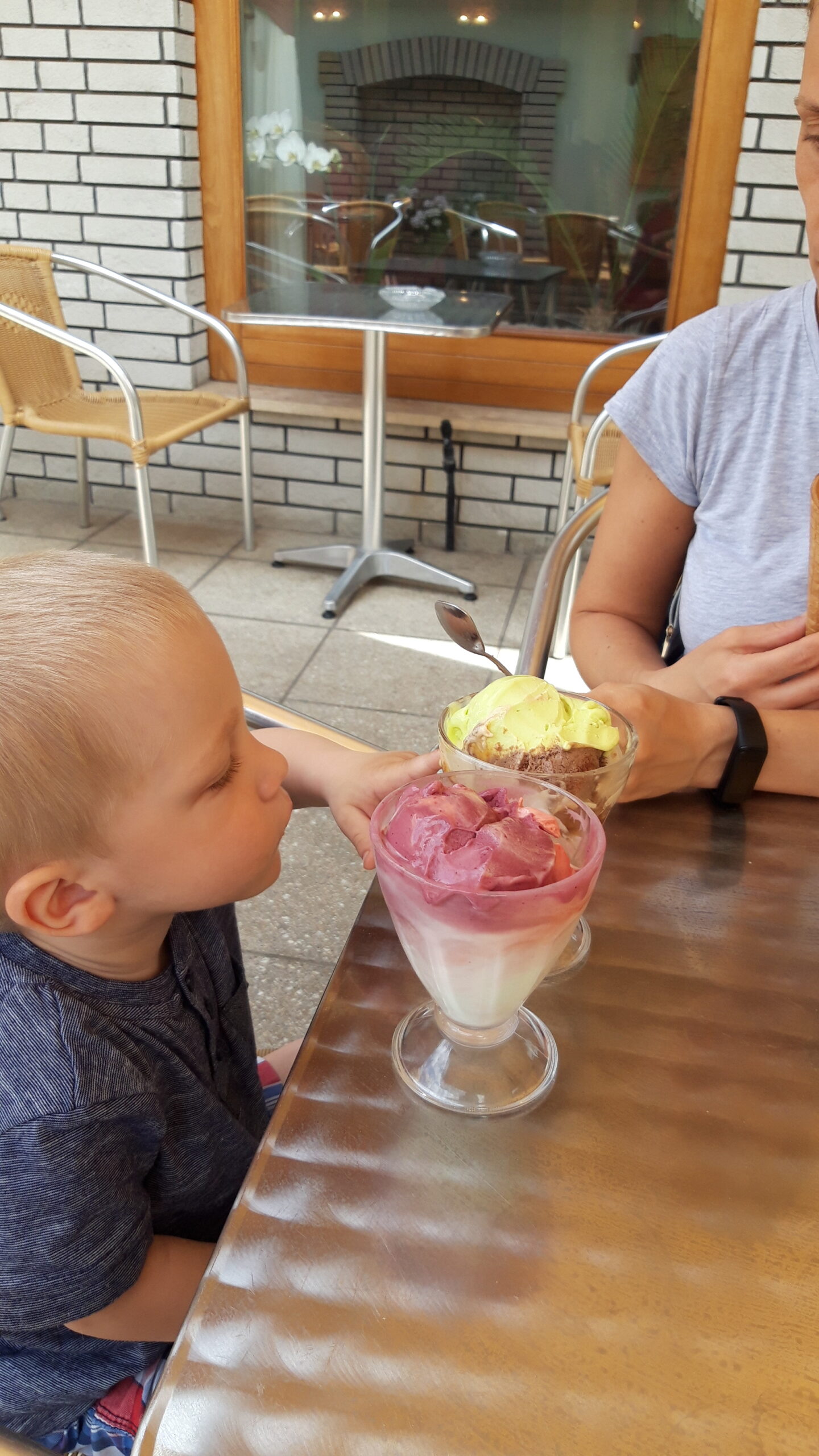 Amikor megérkezett az ebéd akkor én rárepültem a salátára majd a husi is jöhetett. Jó ebéd után jár az édesség, így átmentünk a fagyizóba és megkóstoltam Anya és Apa fagylaltját.